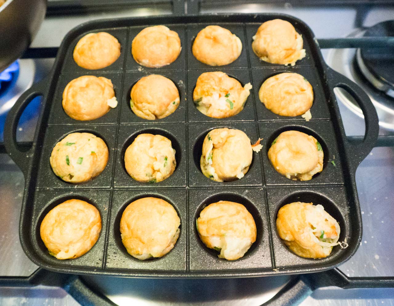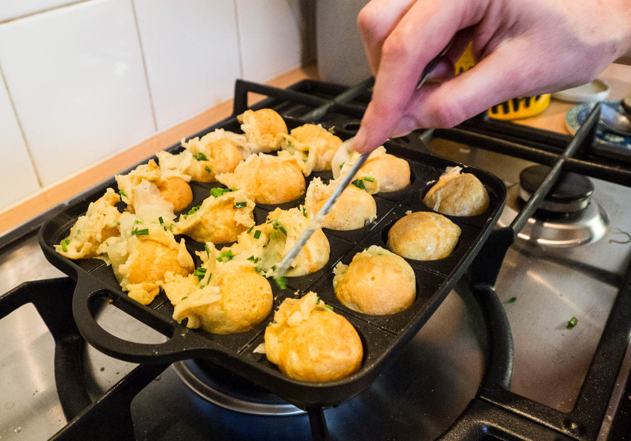 J’ai donc trouvé le dashi en poudre, le gingembre mariné (celui des sushi, il paraît que ce n’est pas le bon mais tant pis) la sauce Otafuku Okonomiyaki, la mayonnaise japonaise Kewpie et le Katsuoboshi (flocons de poisson séché) chez Belasie. Pour faire les takoyaki, il faut verser la pâte dans les trous et ensuite garnir avec ce qu’on veut (poulpe, crevettes,poulet…) puis on tourne les boulettes au fur et à mesure qu’elles cuisent en ramenant les excédents de pâte dans les trous. Curieusement je n’ai pas trouvé ça très difficile à réaliser.