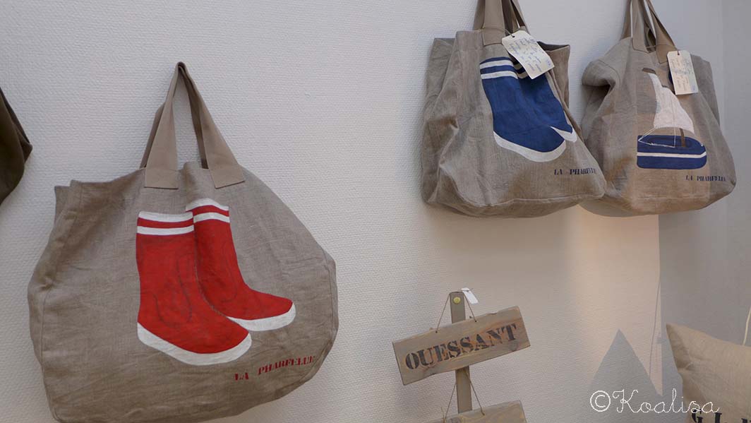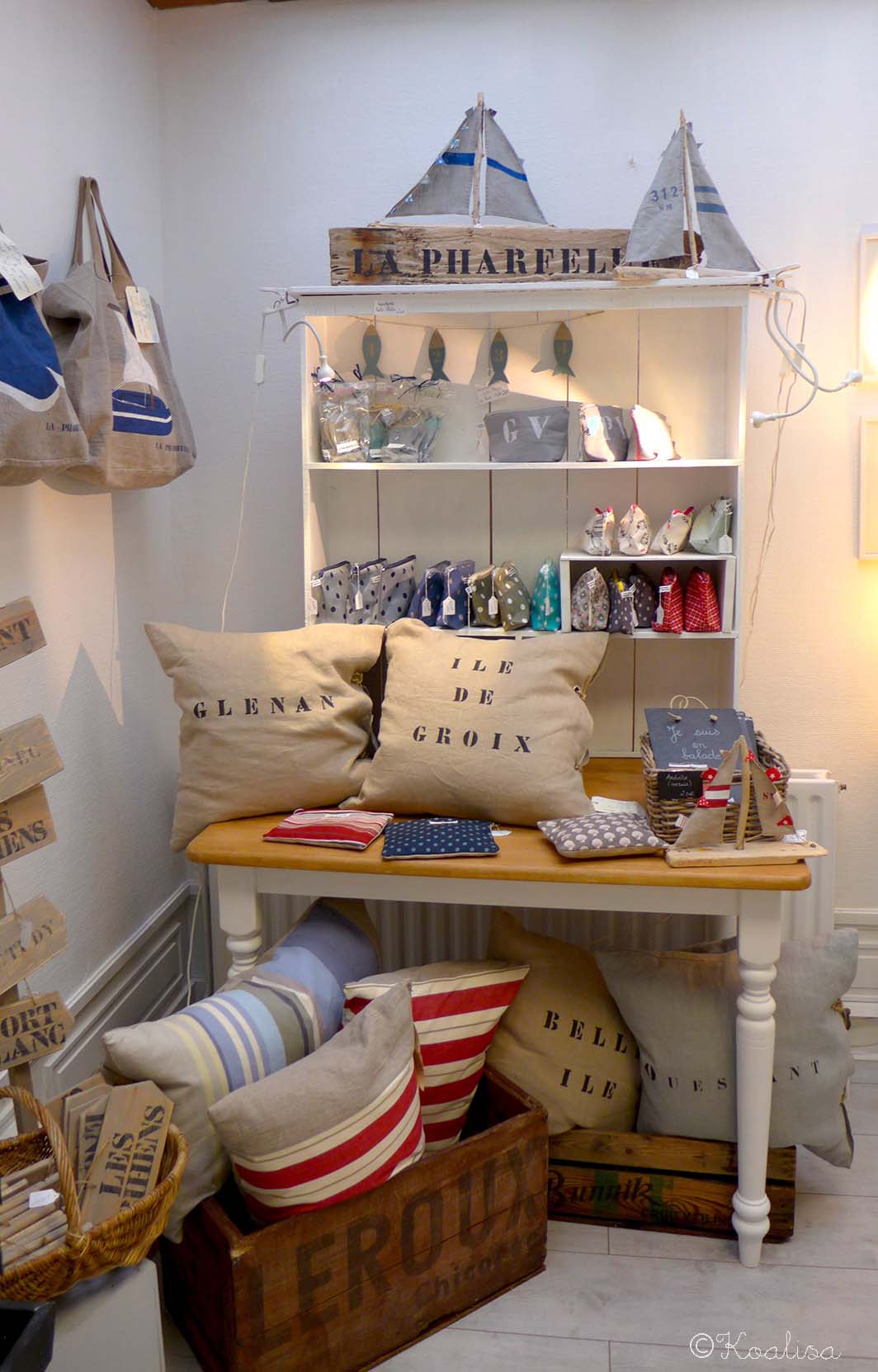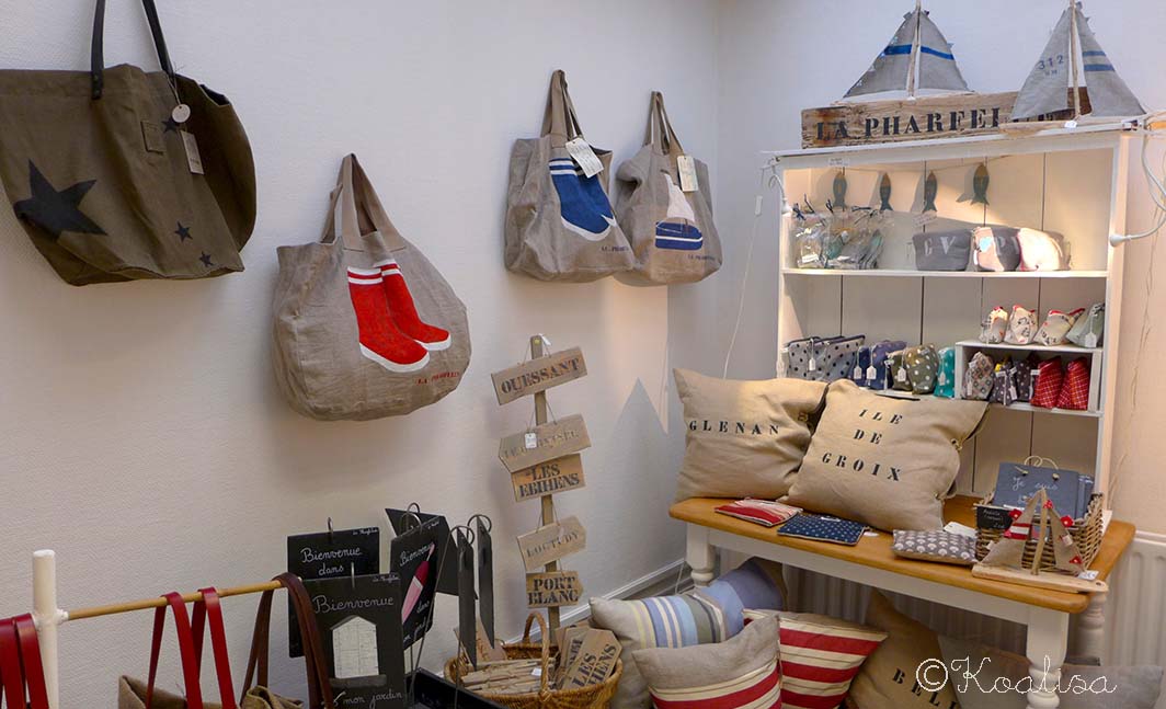 La Pharfelue a un espace tout au fond du magasin, j’y ai retrouvé tout ce que j’aime dans son univers, les bottes, les coussins, les bateaux et aussi les petites pancartes faisant référence à des endroits connus.