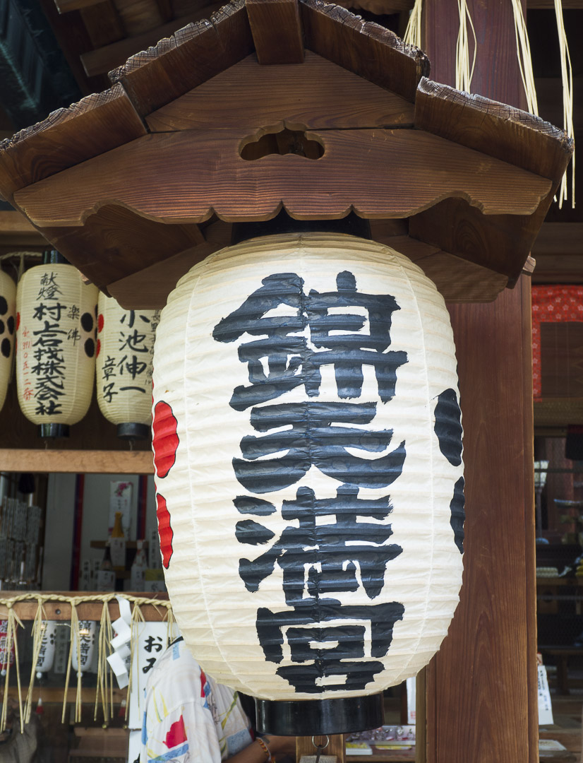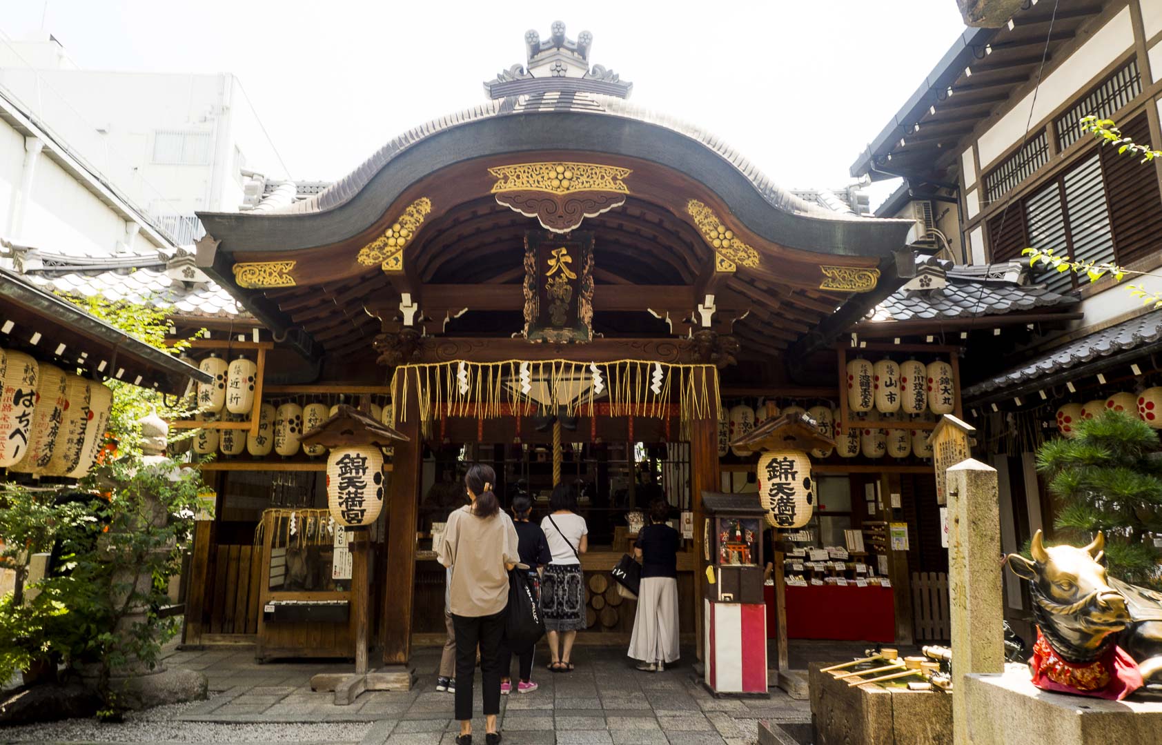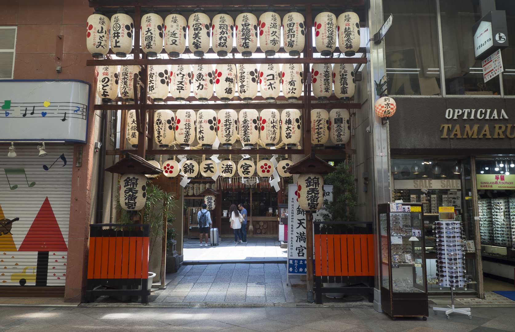 Le petit temple shinto de Nishiki-Tenmangu est dédié à Sugawara Michizane, dieu des études et des affaires (il y a des dieux assez improbables quand même…). On repère le sanctuaire de loin car plusieurs rangées de lanternes décorent son entrée.