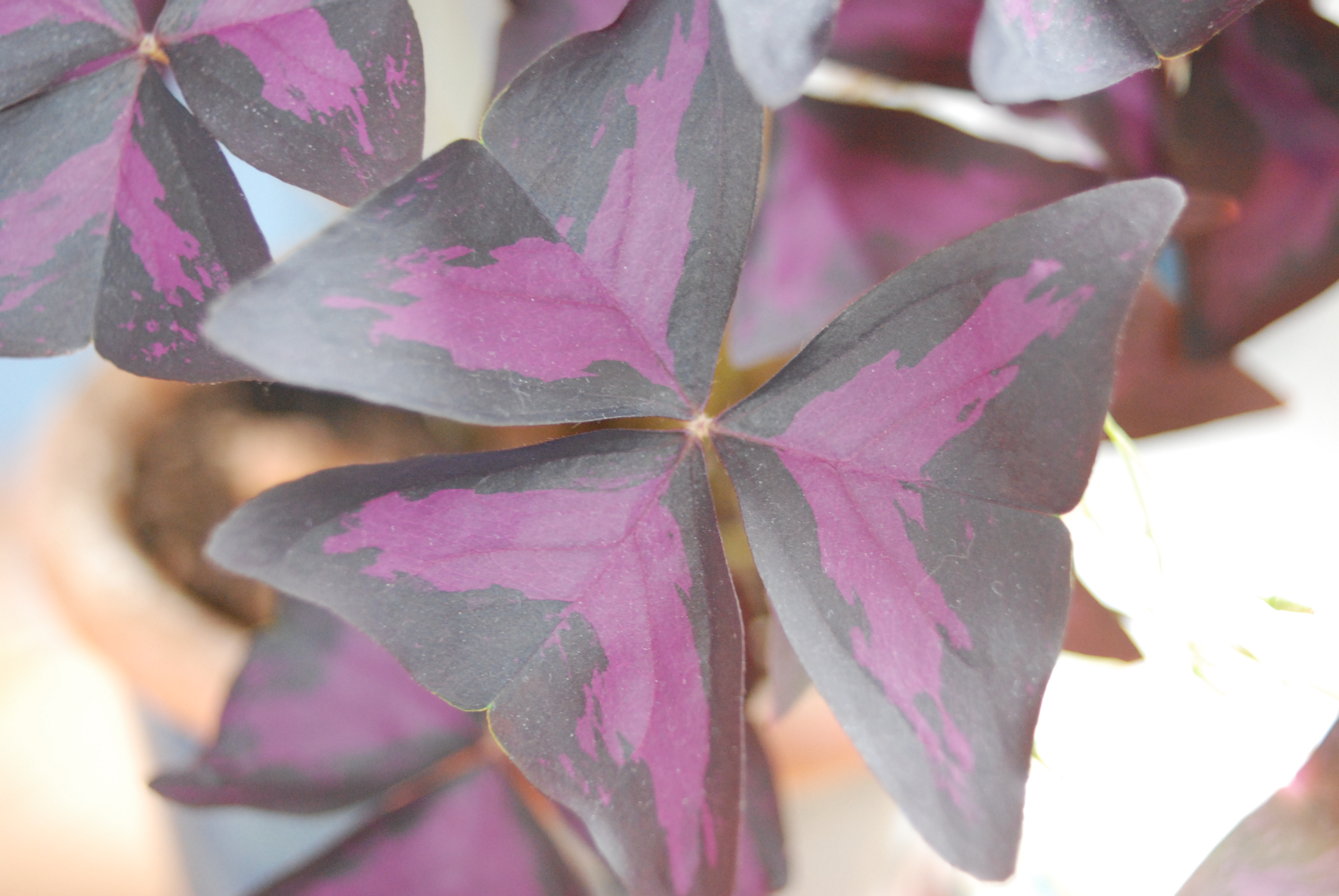 Ce fut un véritable coup de foudre : la forme des feuilles (on dirait des papillons), la couleur pourpre si inhabituelle… Je suis donc partie en quête d’oxalis et là j’ai découvert qu’il y a des centaines de variétés (petites feuilles, grandes feuilles, couleurs différentes etc…). mais je voulais absolument celle-ci: l’oxalis triangularis purpurea.