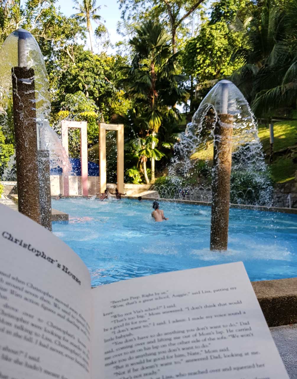 Nous avions emmené le maillot de bain de Canaillou (toujours prêt !) et il ne s’est pas fait prier pour aller tester la pataugeoire située dans un endroit bien ombragé du parc. Les adultes n’ont pas vraiment le droit de s’y baigner mais nous avons quand même trempé les pieds dans l’eau. En fait, beaucoup d’enfants se baignent carrément tout habillés, surtout les filles, ça m’a paru vraiment étrange mais la Malaisie est un pays musulman, il ne faut pas l’oublier…L’accès à la pataugeoire et aux jeux d’eau est gratuit et je me suis dit que ce serait bien sympa d’avoir ça dans notre petit parc à Rennes ! J’ai même bouquiné un peu, comme en France.