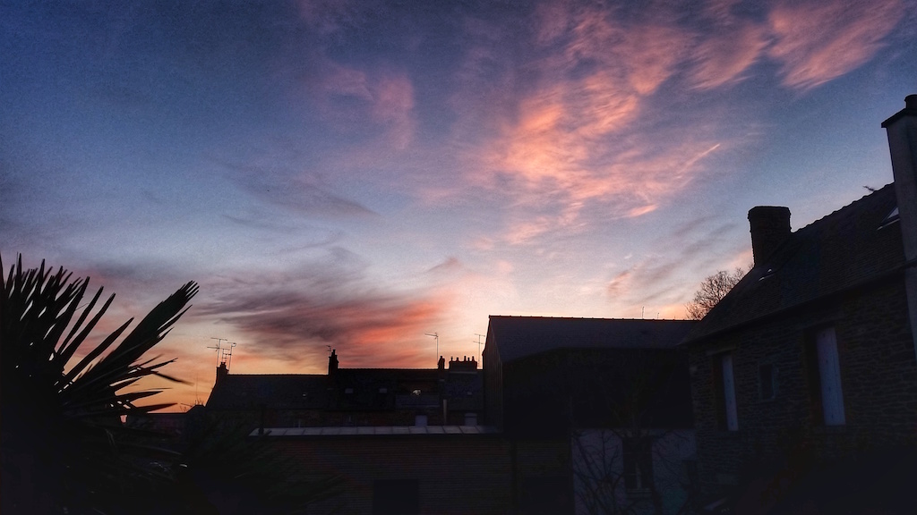 Il fait froid froid froid ! Nous avons des températures négatives depuis plusieurs jours et les minettes ne mettent quasiment plus le bout du nez dehors, c’est dire… Le bon côté des choses, c’est qu’on a un beau ciel bleu et du soleil, et ça, ça fait du bien. En prime, voici mon ciel rennais de ce matin :
