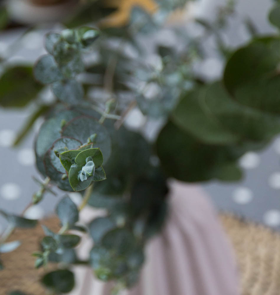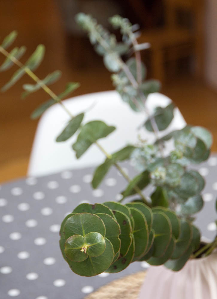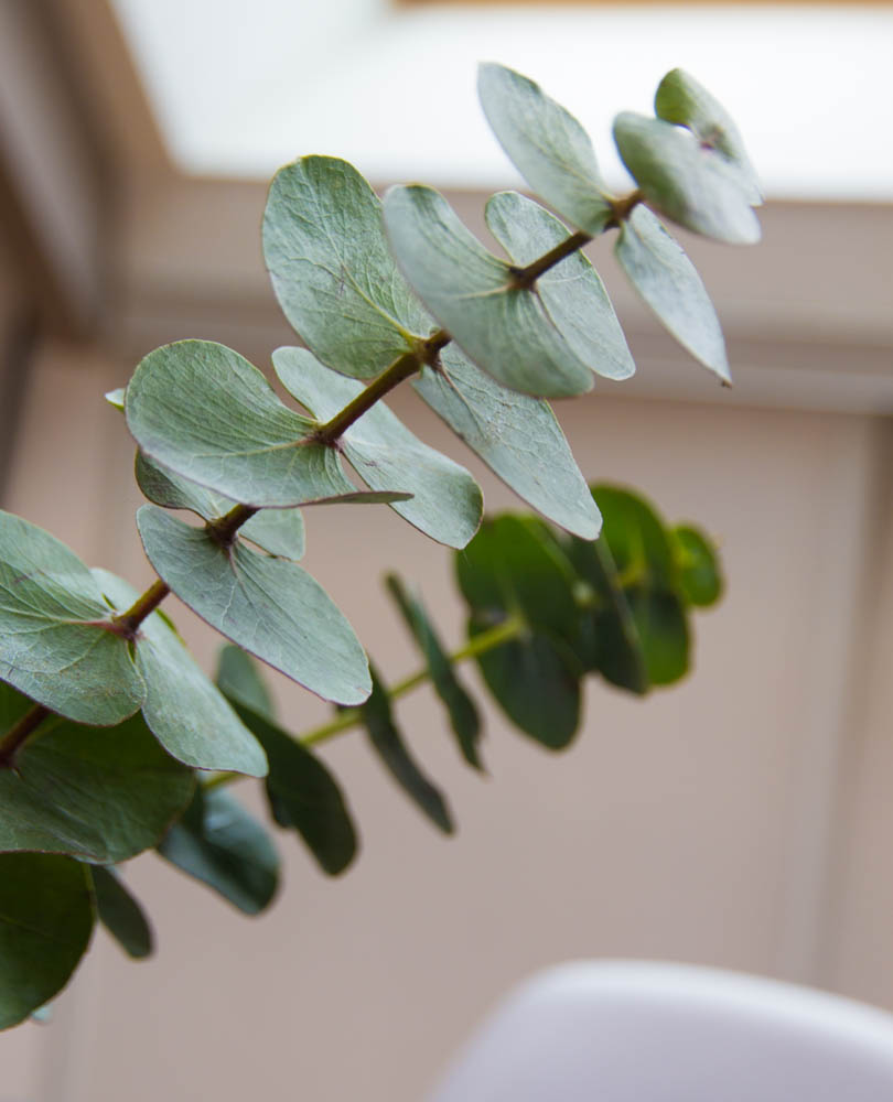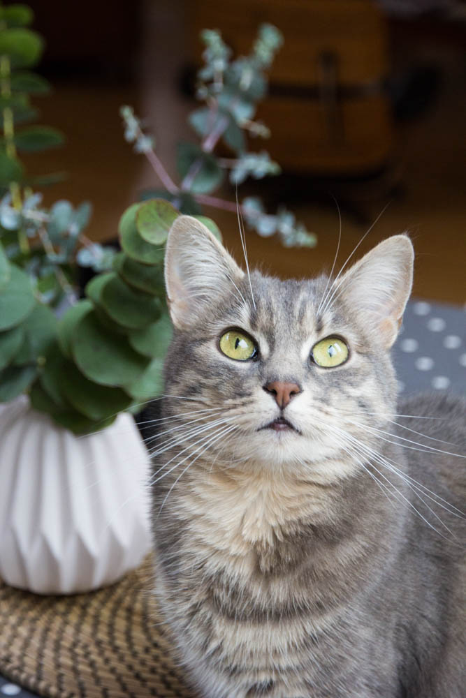 En ce moment j’aime faire des bouquets d’eucalyptus sans y ajouter de fleurs, je trouve que cette plante est très décorative par elle-même. En plus le bouquet dure très longtemps et on peut même le faire sécher ensuite. Vous constaterez que la séance photo a attiré Savannah qui a piqué la vedette à l’eucalyptus.