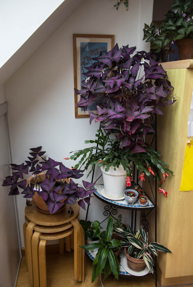 Et l’oxalis, pourpre et verte, ma plante préférée depuis au moins 10 ans, avant qu’elle devienne tendance. Et je confirme que les boutures à partir d’une tige laissée dans l’eau marchent très bien.
