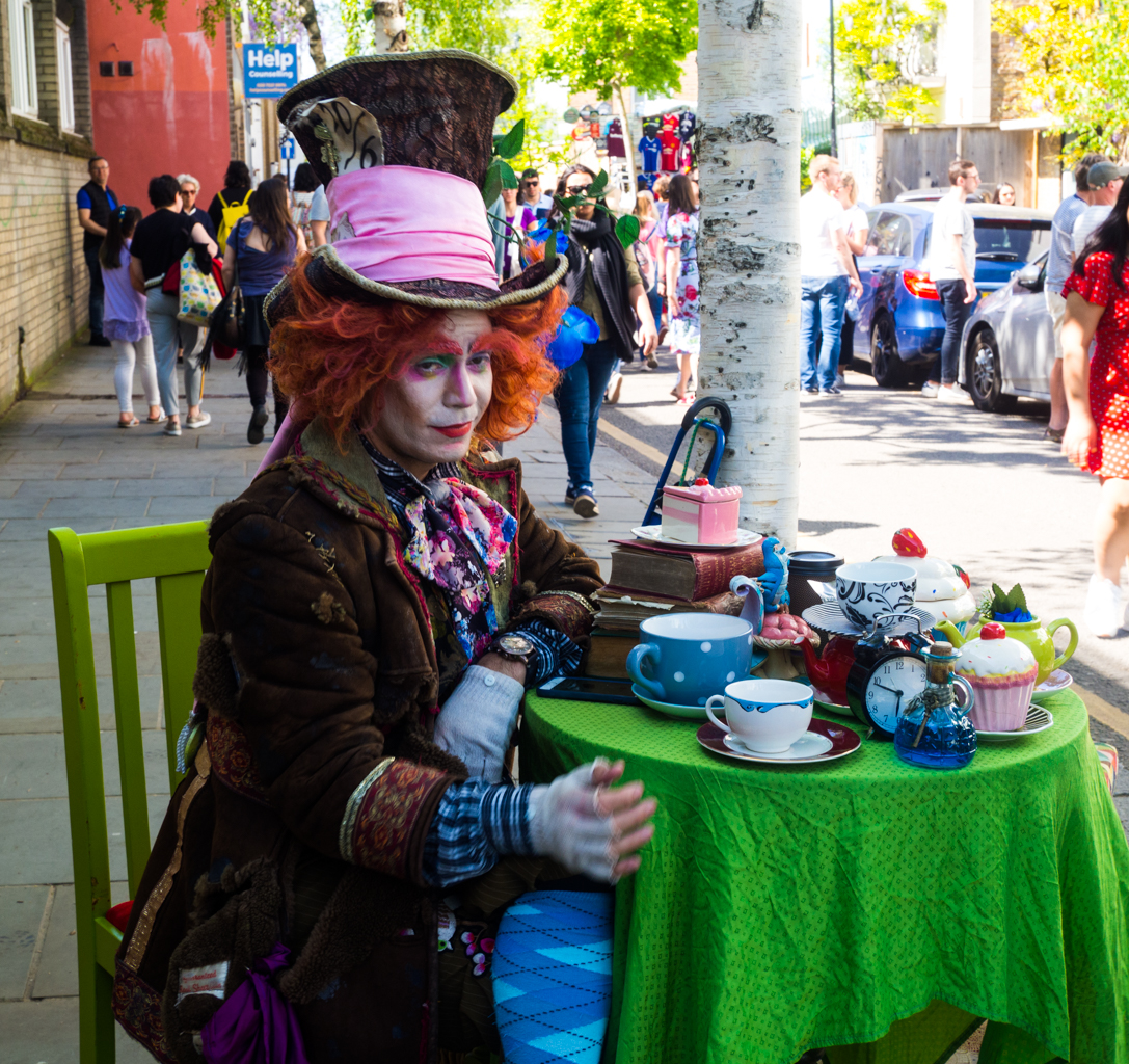 Portobello est l’antre de l’excentricité britannique dans toute sa splendeur. On y trouve ainsi un Chapelier Fou tout droit sorti de chez Lewis Carroll , installé sur le trottoir avec la table mise pour le thé. On peut, moyennant finances, faire un selfie avec lui. Pas si fou, finalement !