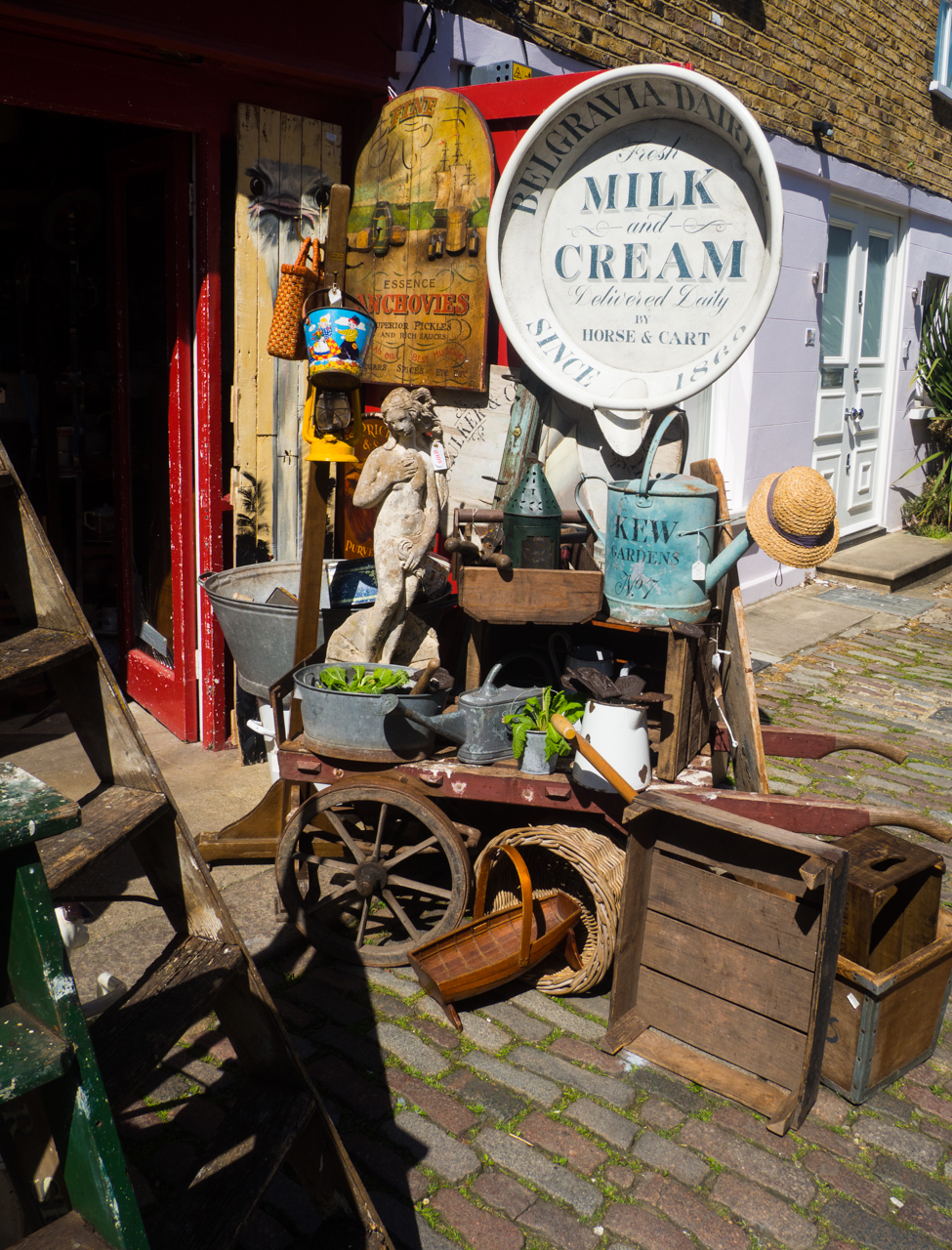 Portobello Market, c’est une brocante immense située à Notting Hill à Londres. Curieusement je n’avais encore jamais eu l’occasion d’y aller, et j’ai voulu profiter du fait que nous étions à Londres un samedi pour aller faire une balade en famille à Portobello Road. Seulement je ne me rendais absolument pas compte de la foule qui serait sur place ! J’avais pensé déambuler tranquillement dans le beau quartier de Notting Hill mais malheureusement il y avait tellement de monde que je n’ai pas pu faire de jolies photos.