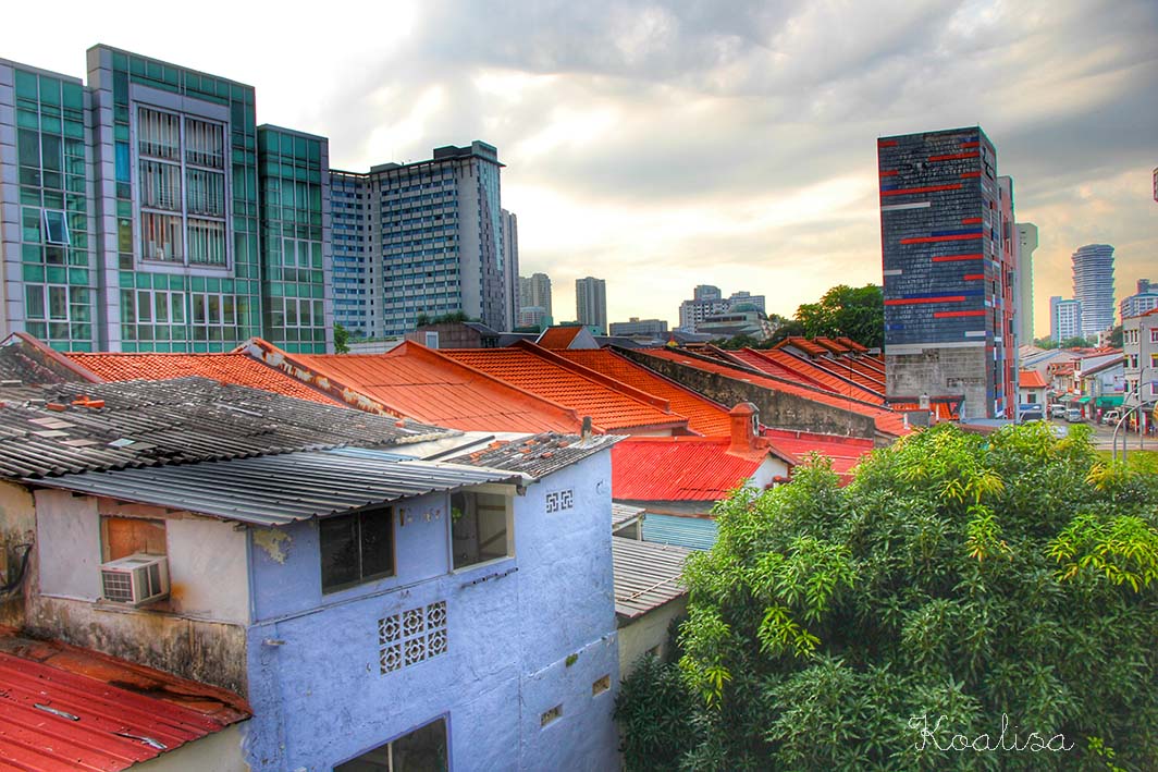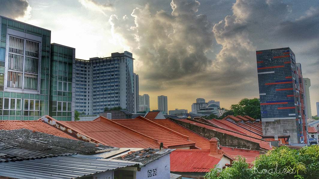 Nous avions aussi un petit balcon où nous avons pris le petit déjeuner tous les matins, tant que la température était supportable. J’en ai profité pour prendre des photos du ciel de Singapour et aussi de la vue depuis l’appartement.