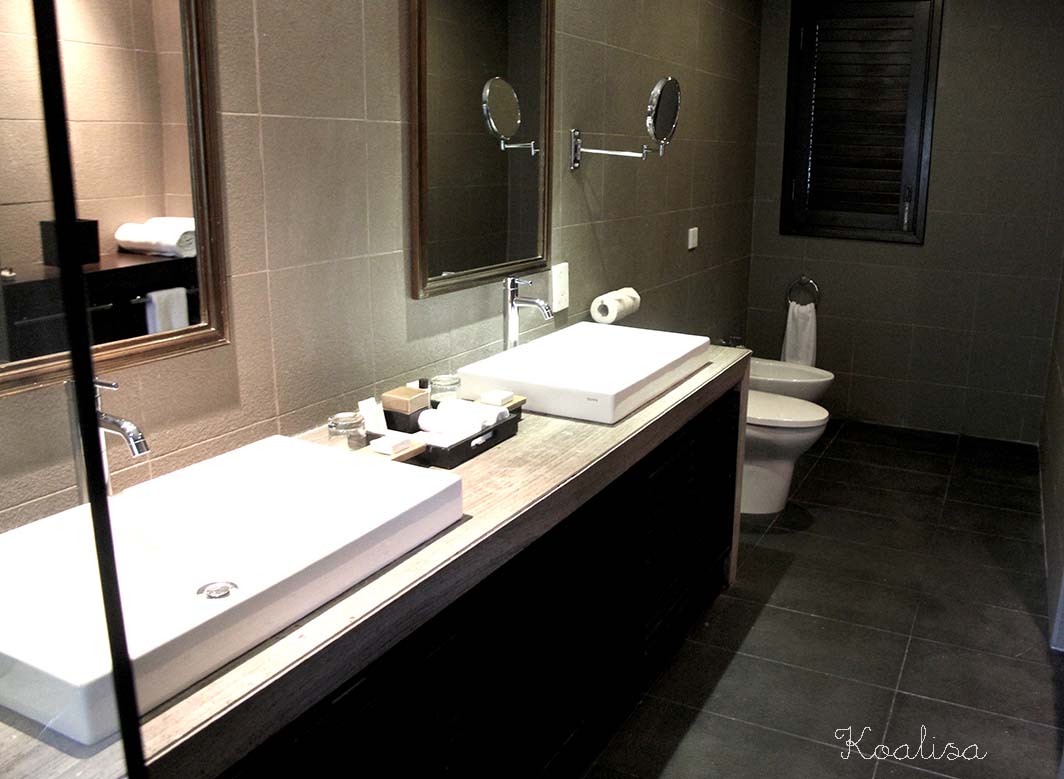 Les suites sont spacieuses, avec un salon et une chambre ( Canaillou avait son lit dans le salon). La salle de bains est également très agréable avec deux lavabos, une douche et une baignoire.