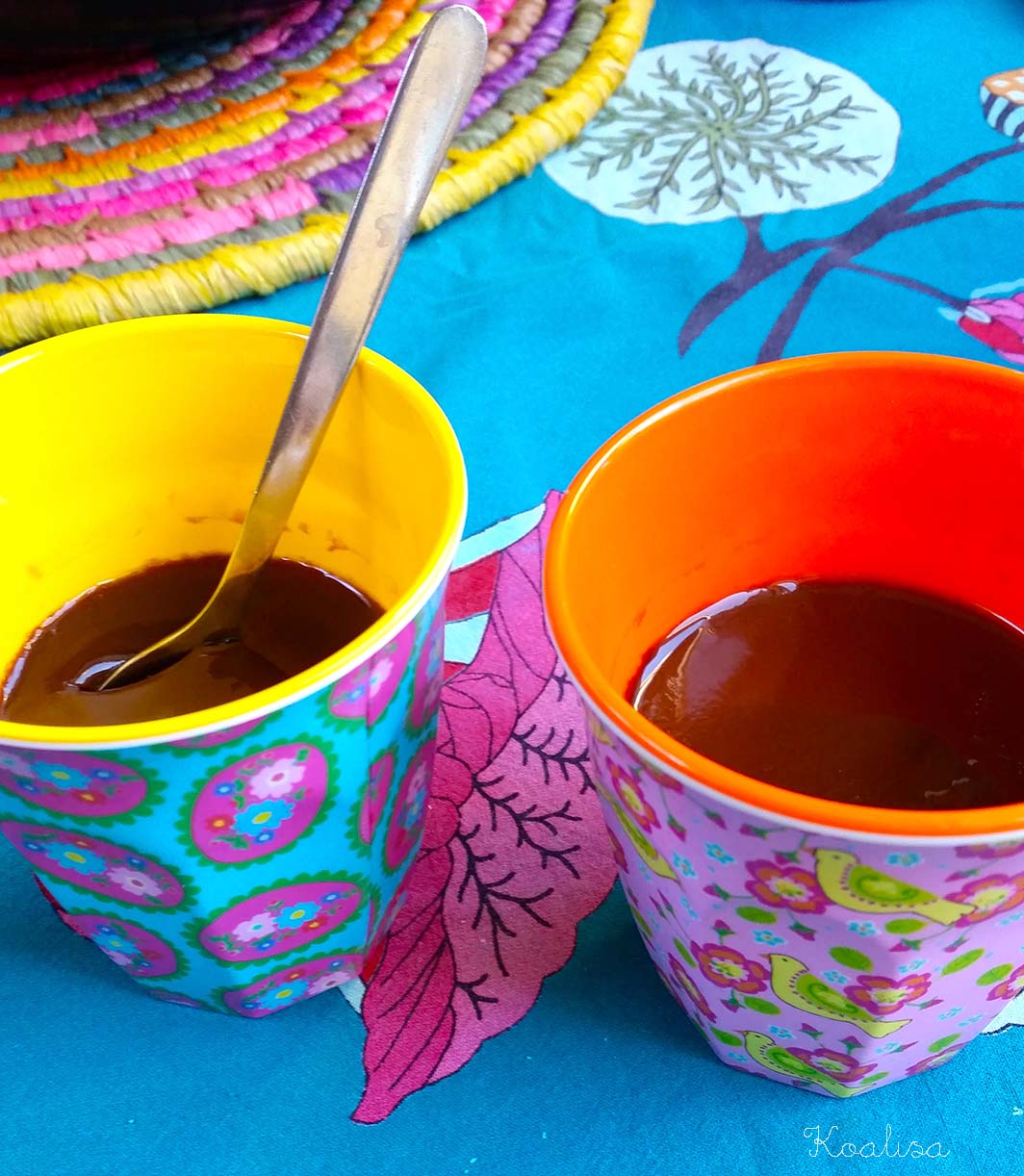 Comme il ne mange pas de yaourts au lait de vache, je lui fabrique des desserts au chocolat à base de lait de riz. D’ailleurs j’en mange aussi, c’est très bon ! Ca revient beaucoup moins cher de les faire soi-même et on ne jette pas de pots en plastique.