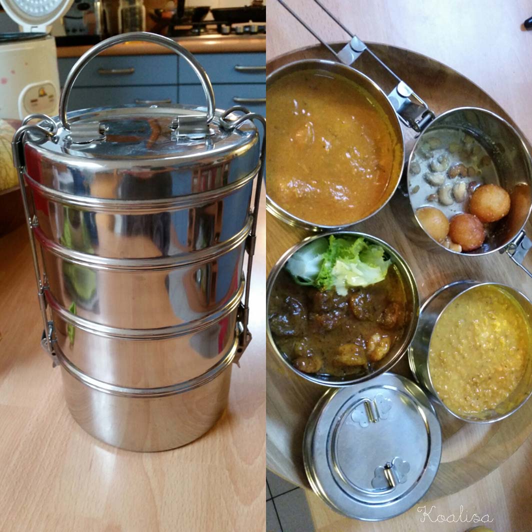 Nous utilisons une gamelle en inox quand nous achetons des plats à emporter dans notre restaurant indien favori. Finies les barquettes en plastique qui atterrissent à la poubelle… J’ai eu l’idée d’acheter cette lunchbox après avoir vu que mes beaux-parents en utilisaient une quand ils allaient chercher des plats tout prêts chez l’indien du coin !