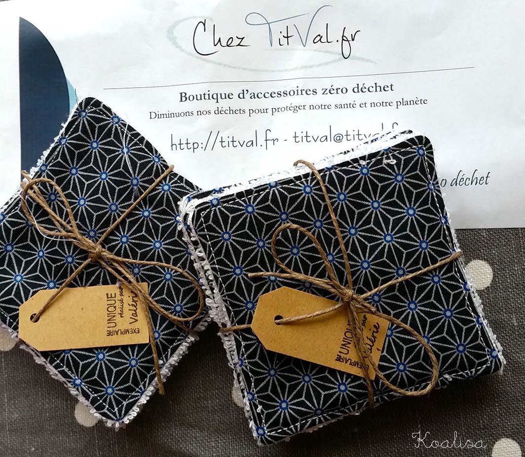 J’ai investi dans des lingettes démaquillantes en tissu trouvées chez Titval. Je vous les conseille, en plus elles sont très jolies. Et comme Titval est rennaise, ça nous a permis de nous rencontrer. D’ailleurs j’essaie maintenant de privilégier les petits créateurs, c’est souvent mieux fait et moins cher que la grande distribution.