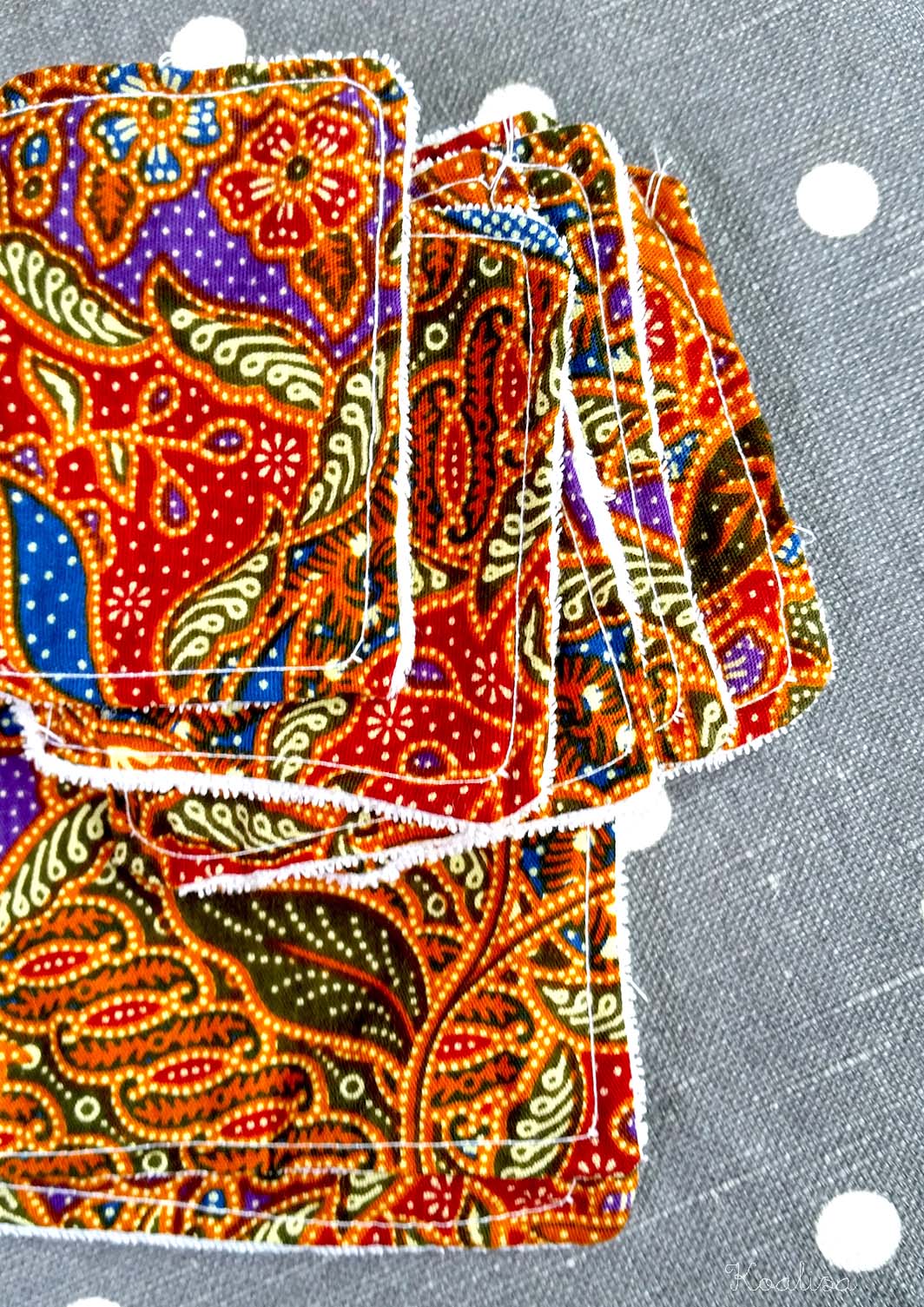 Et depuis que j’ai acheté ces lingettes, j’ai essayé de m’en faire moi-même grâce à ce tuto très bien fait trouvé chez Des miettes dans mon clavier. Voici le résultat : j’ai utilisé du joli tissu rapporté cet été de Malaisie et… des vieux bavoirs de Canaillou ! Je suis loin d’être experte, hein, alors soyez indulgents… ;). J’en ai profité pour faire des lingettes plus grandes pour débarbouiller Canaillou (voir paragraphe sur la pâte à tartiner au chocolat plus bas …).