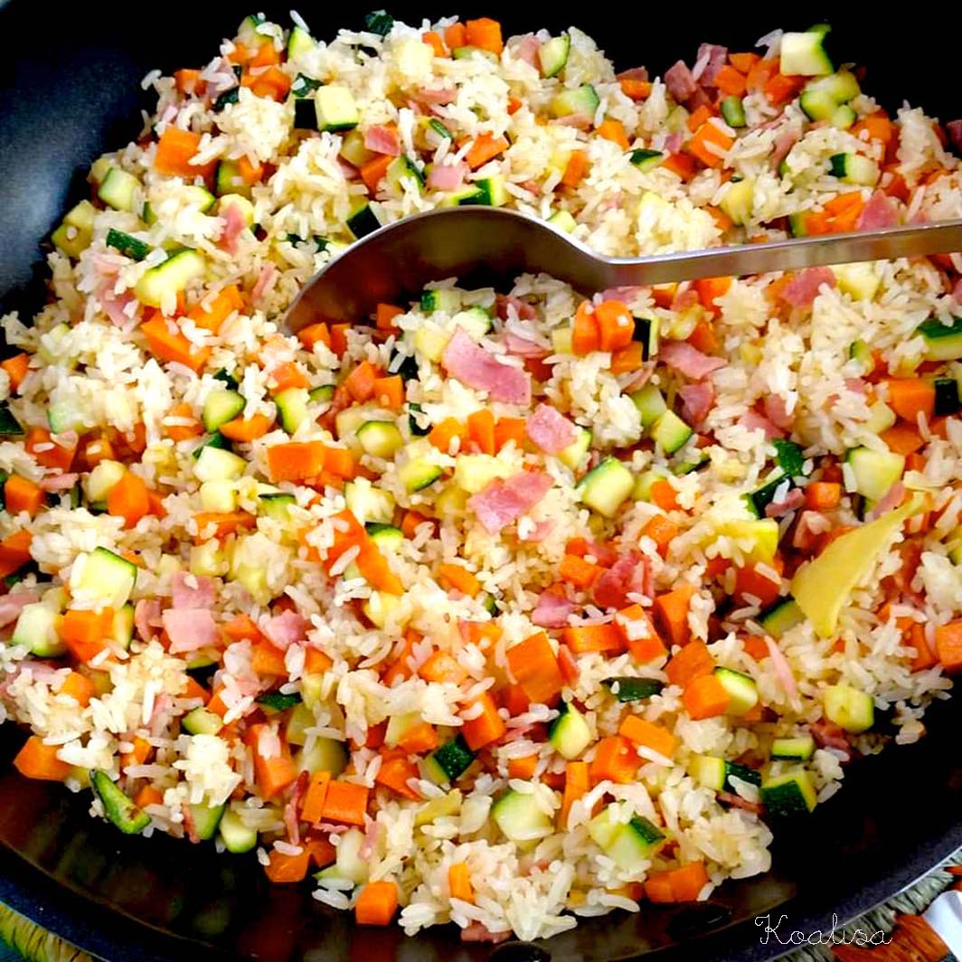 Alors il faut savoir que dans beaucoup de familles asiatiques, le riz cantonais, c’est le truc qu’on fait quand on a des restes… Mercredi soir j’étais en manque d’inspiration et mon mari, dans ces cas-là, propose souvent de faire du riz cantonais. Mais il ne fait jamais deux fois la même recette puisque finalement il récupère les fonds de frigo !