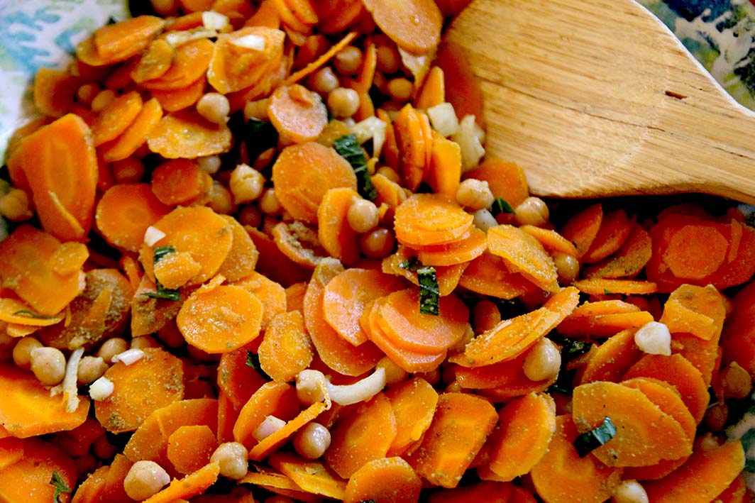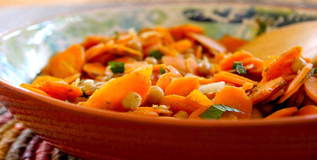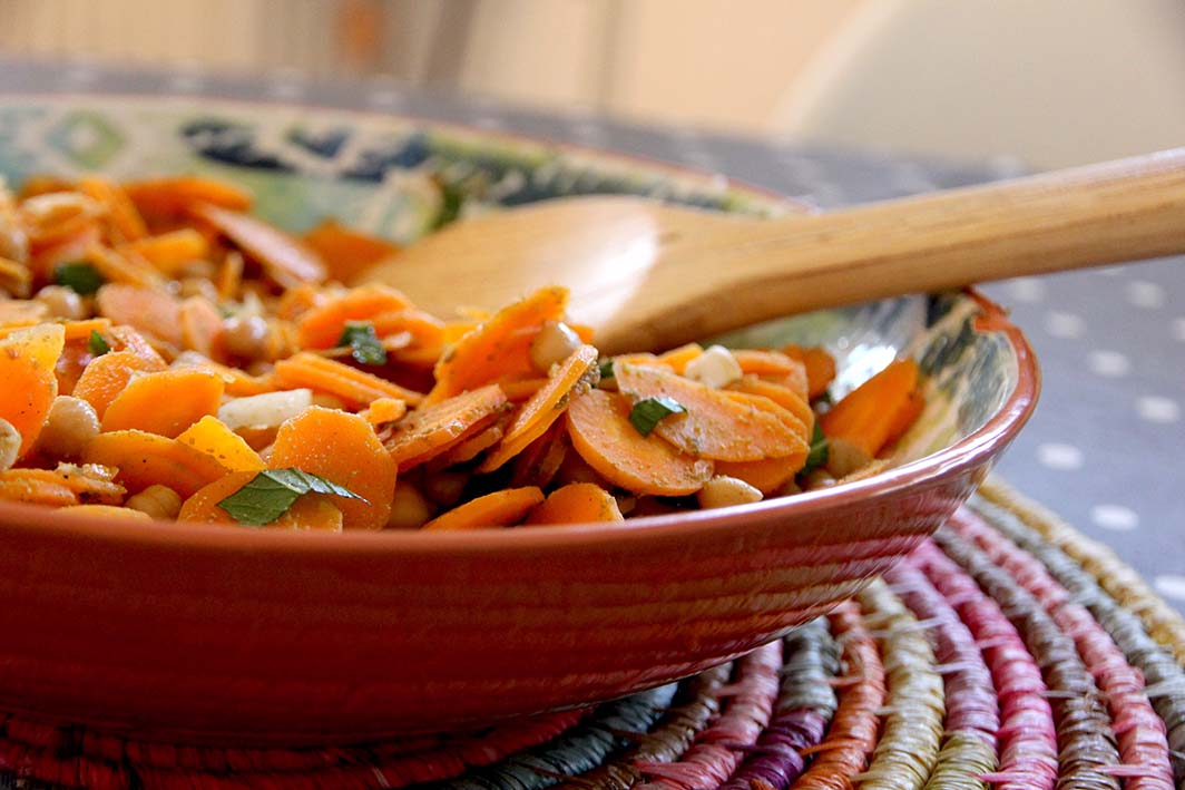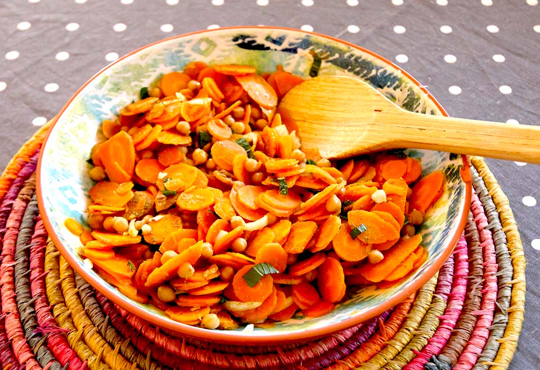 Verser les pois chiches égouttés dans un plat. Ajouter 3 cuillères à soupe d’huile d’olive (ou moins, c’est vous qui voyez !) et le jus de citron. Mélanger avec les carottes, deux cuillères à café de cumin moulu, saler, poivrer. Ajouter la menthe et servir.