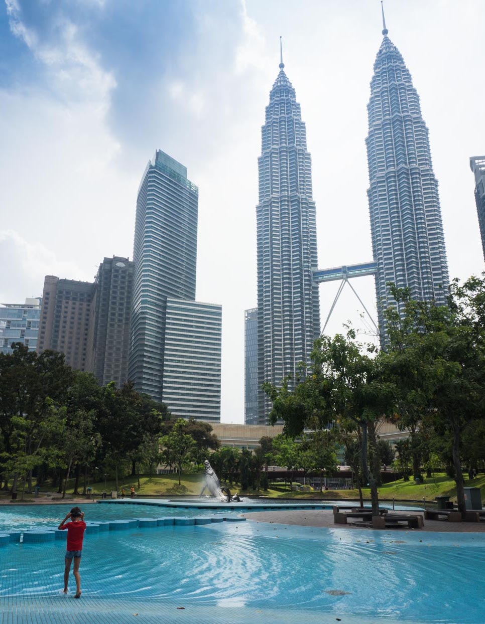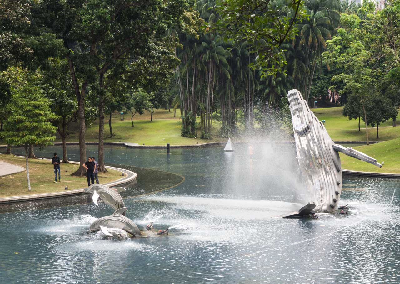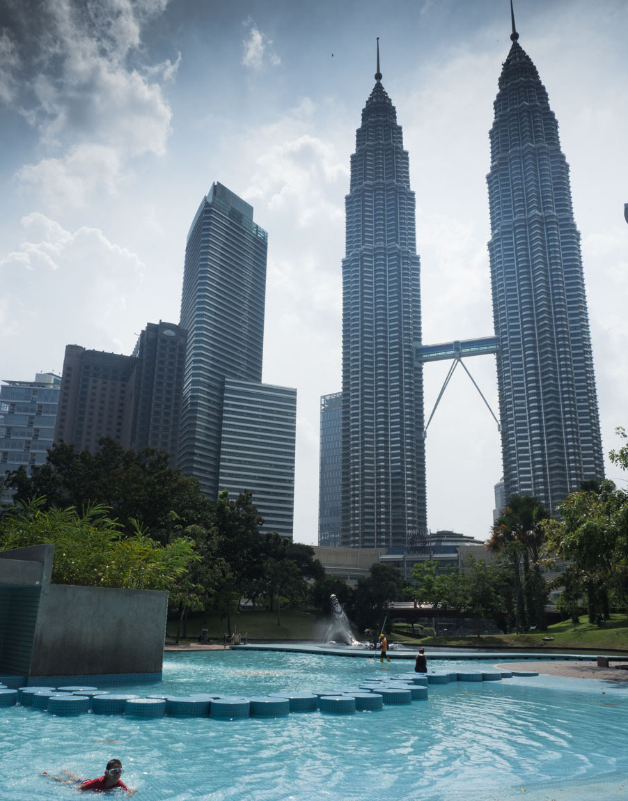 Je continue mes billets sur la Malaisie avec KLCC Park (ou Taman KLCC en malais), qui est un parc urbain de 20 hectares créé en 1998. Il se situe juste à côté des tours Petronas à Kuala Lumpur. J’avais eu l’occasion de l’admirer depuis le sommet des tours mais ne l’avais jamais visité. Ayant entendu parler de sa pataugeoire pour les enfants, Canaillou avait envie d’y faire une petite balade. Le parc comporte également un lac, une piste de jogging, diverses fontaines et sculptures et même une mosquée !