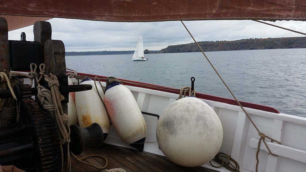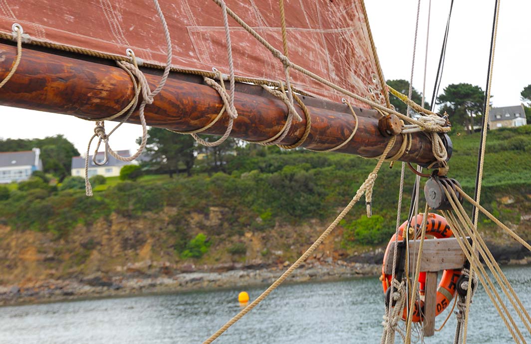 La dernière sortie que j’avais faite en mer, c’était à bord du TS 42 Guyader Gastronomie. Inutile de vous dire que le contraste ne pourrait pas être plus flagrant avec la Belle Etoile ! Sur un bateau en bois, tout craque et fait du bruit, les voiles sont lourdes et c’est un véritable effort que de les hisser !