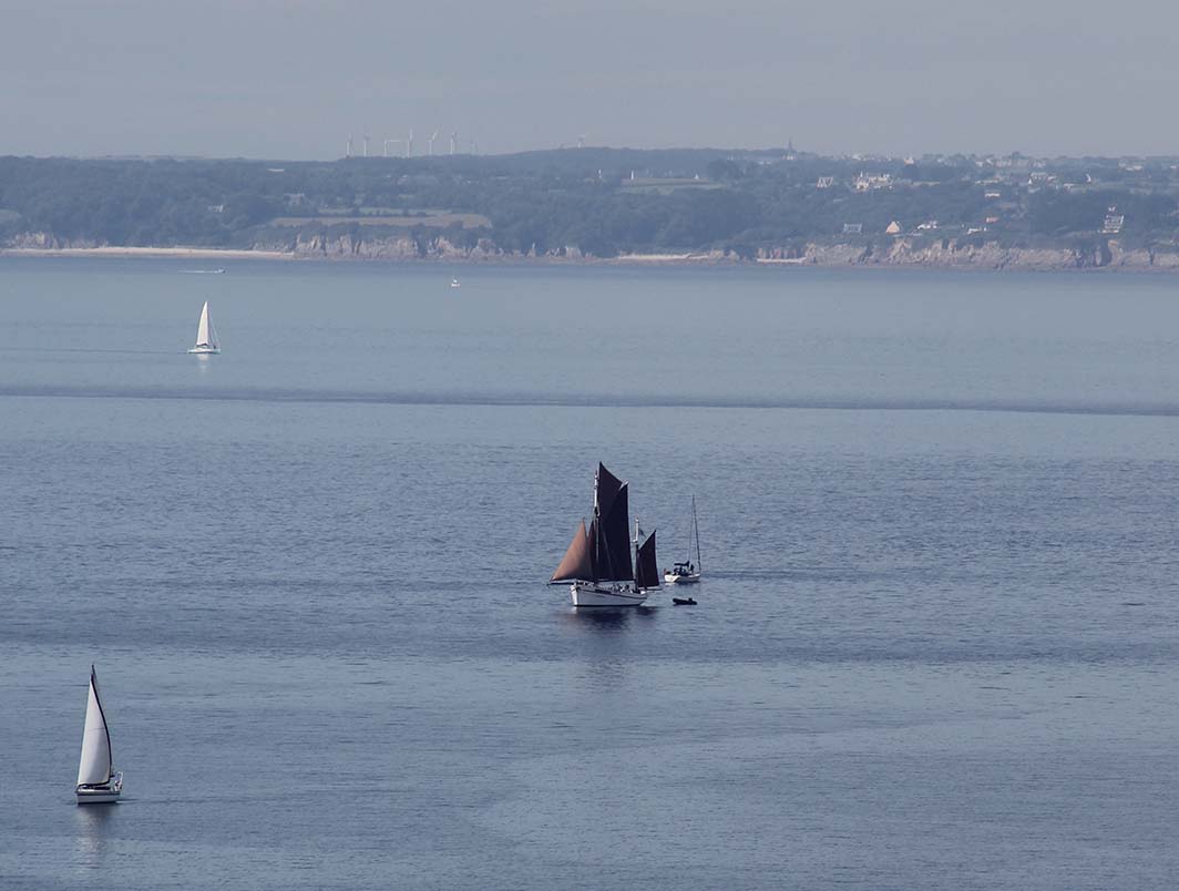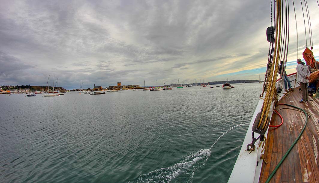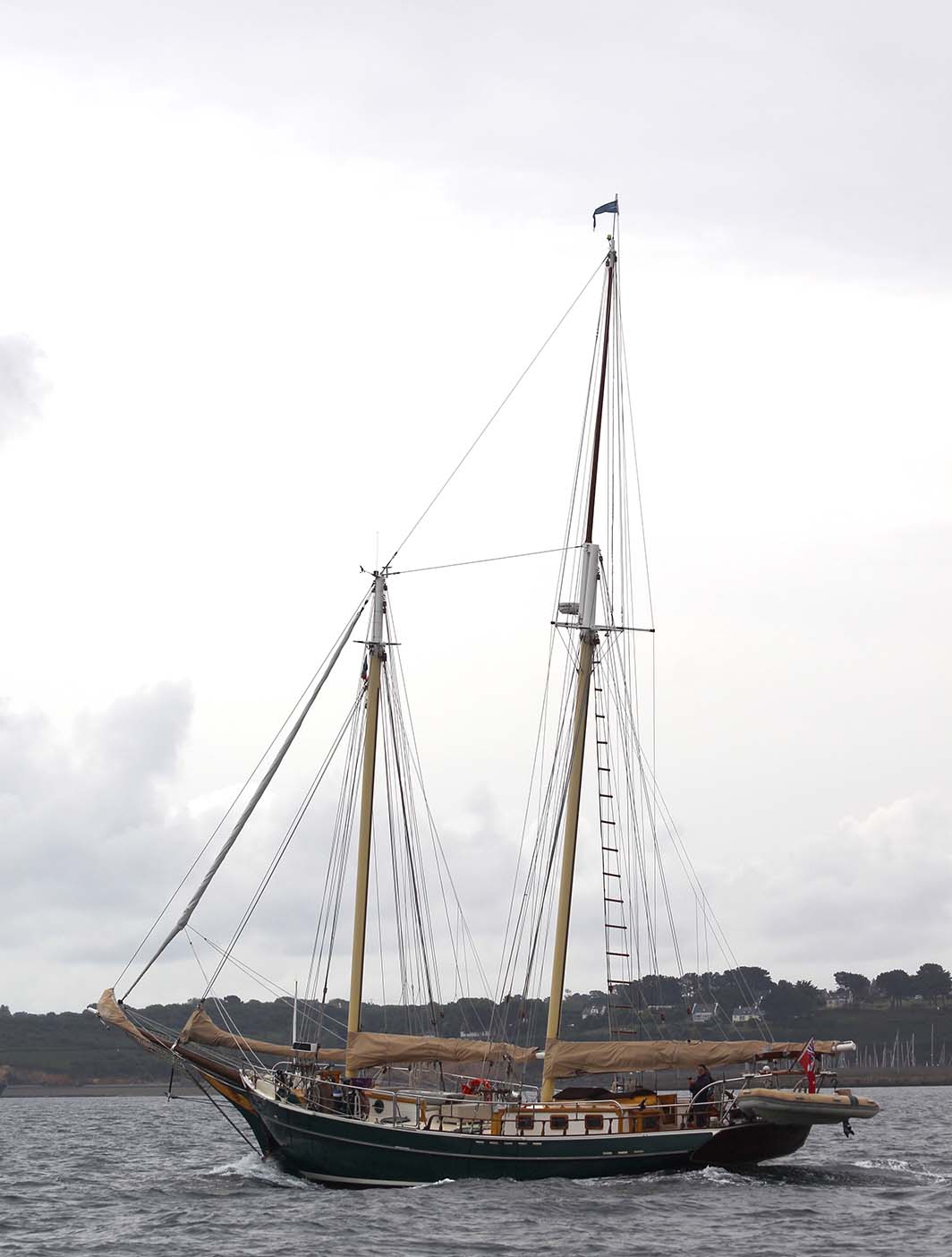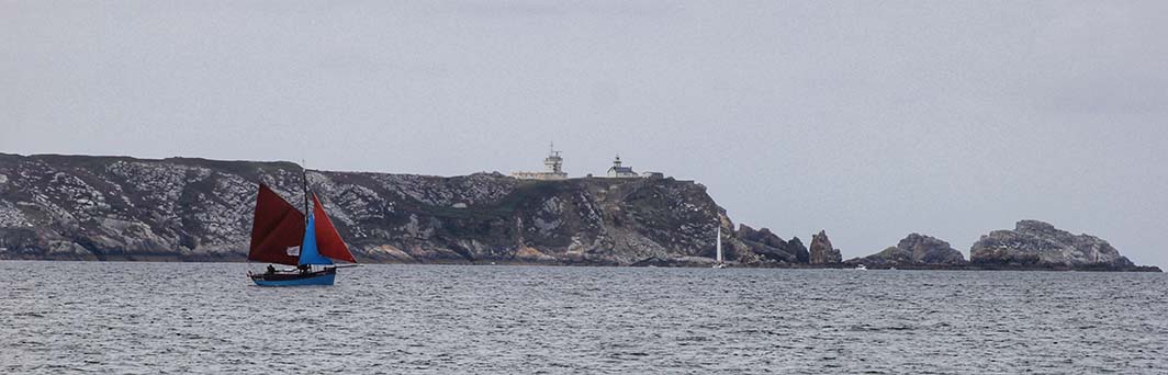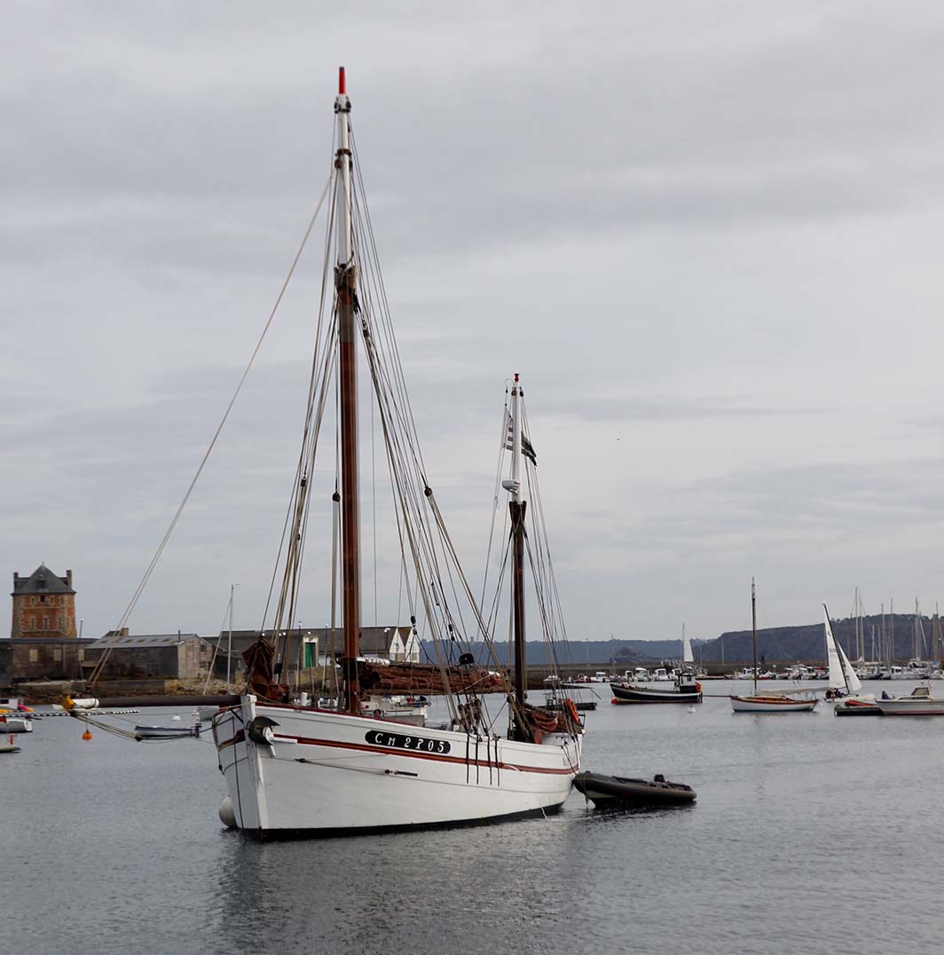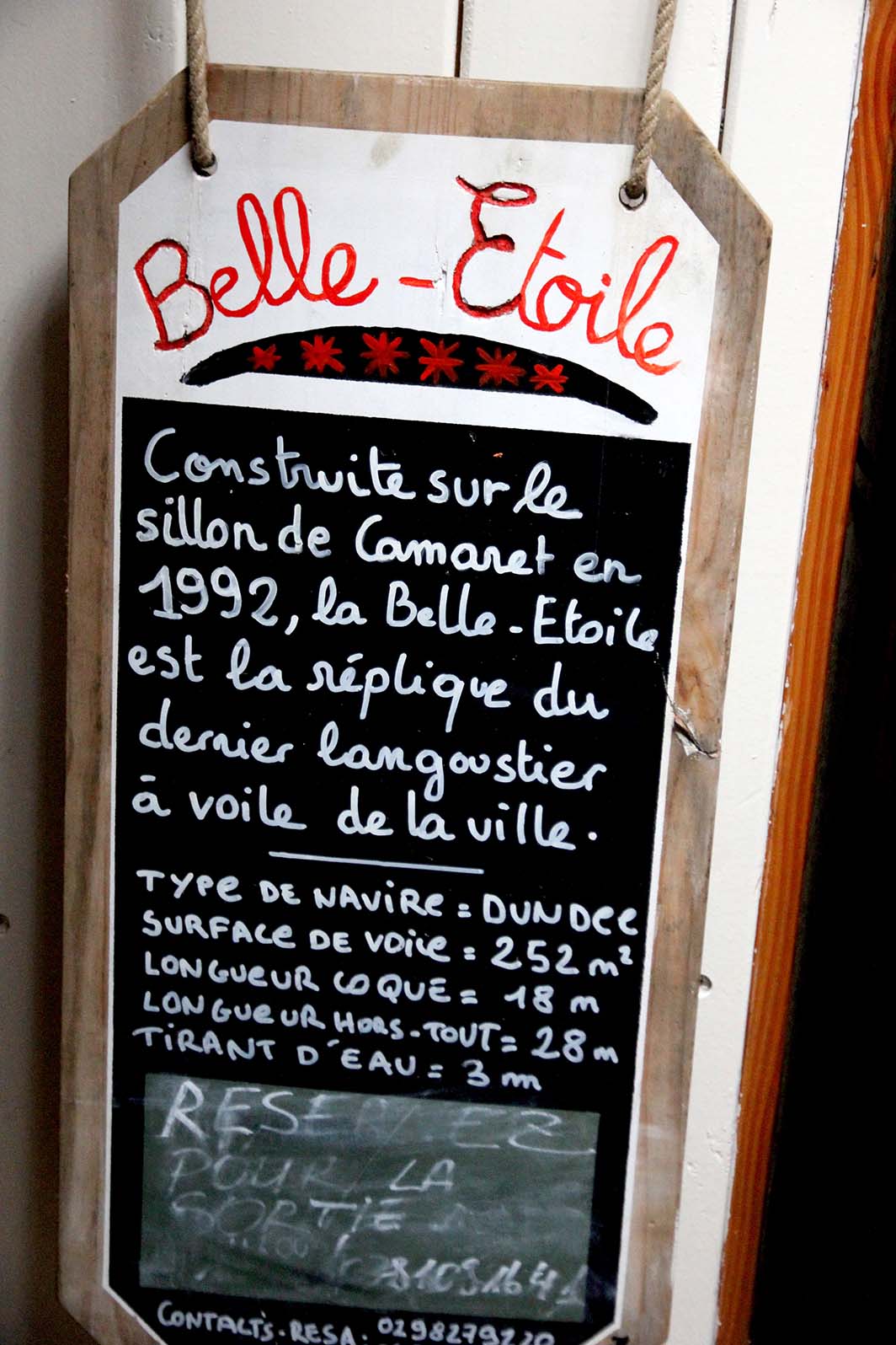 Pendant notre séjour sur la presqu’île de Crozon, nous avions très envie de refaire une balade en bateau. Mais cette fois nous voulions quelque chose de différent… En effet nous avons fait et refait les promenades habituelles en vedette, très sympathiques certes, mais bruyantes et encombrées. Et il y a deux ans j’avais vu qu’un beau bateau, nommé Belle Etoile, naviguait à proximité de Camaret. Renseignements pris auprès du Club Léo Lagrange de Camaret, ce bateau est la réplique du dernier langoustier à voile de Camaret, construit en 1938. Cette réplique, construite à l’identique en 1992, est classée Bateau d’Intérêt Patrimonial, et il est possible d’y embarquer pour des sorties en mer à la demi-journée ou à la journée. On peut même y passer un week-end à naviguer vers l’île de Sein ou l’île d’ Ouessant.