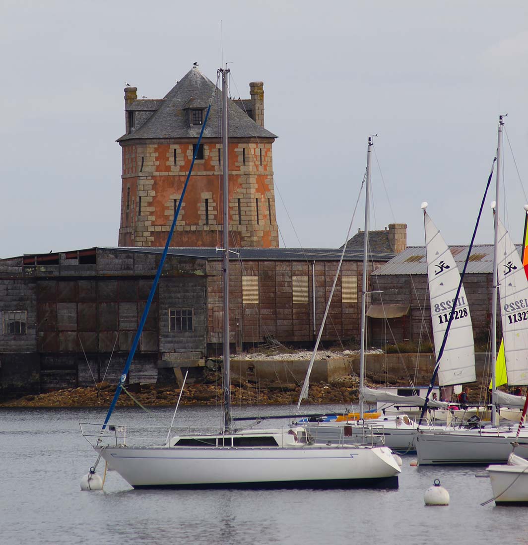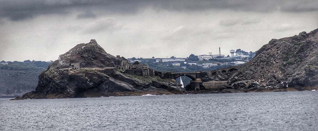 Nous avons pu voir le Fort des Capucins sur son ilôt, et le pont qui le relie à la pointe des Capucins. On aperçoit la rade de Brest derrière.