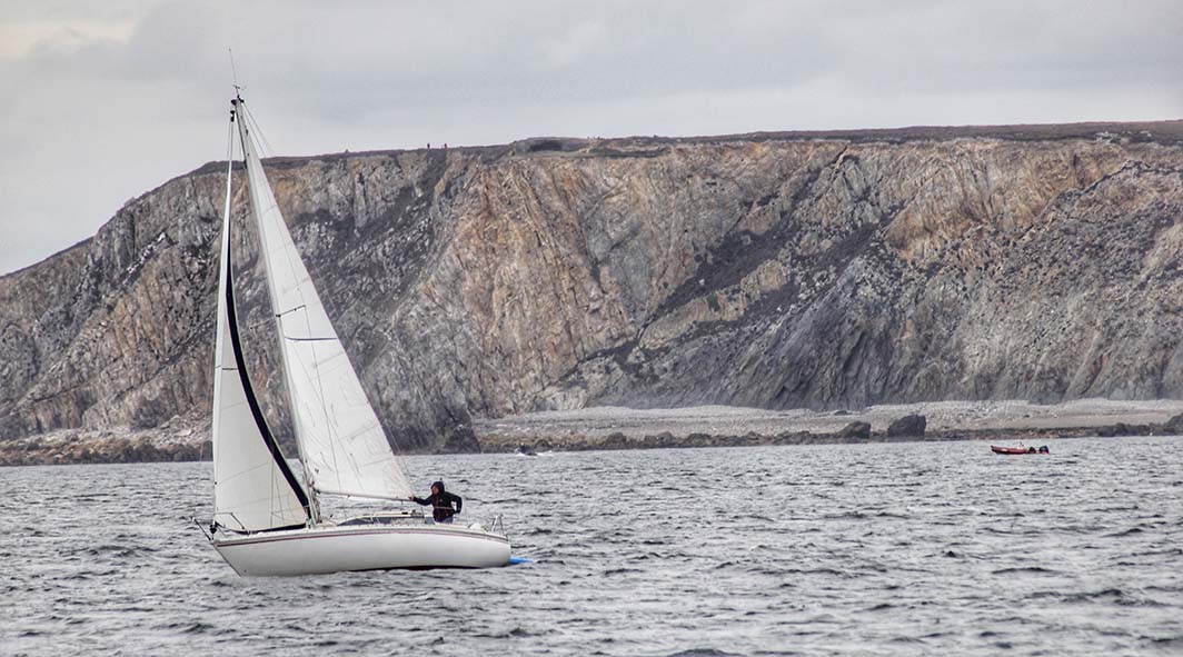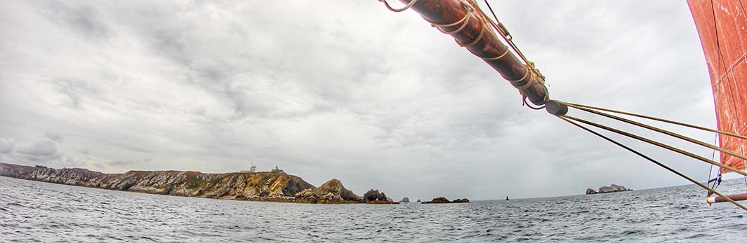 Lors de cette balade de trois heures, nous sommes allés jusqu’aux Tas de Pois pour revenir ensuite à Camaret. Le temps n’était pas franchement de la partie même si la journée avait bien commencé avec le soleil (décidément, c’est une habitude, il fait mauvais dès que je mets le pied sur un bateau !) mais nous avons vraiment apprécié cette sortie. Heureusement nous avions prévu les pulls et les cirés ! Canaillou a adoré participer à la manoeuvre… et regarder la mer !