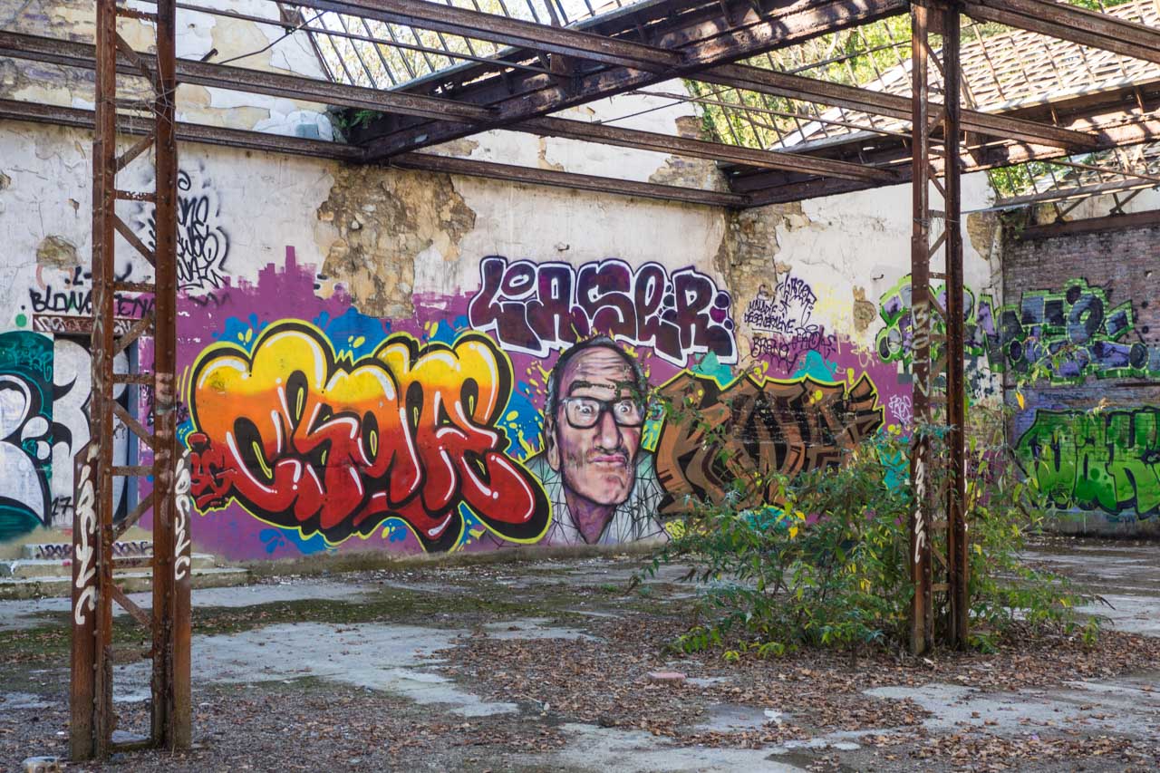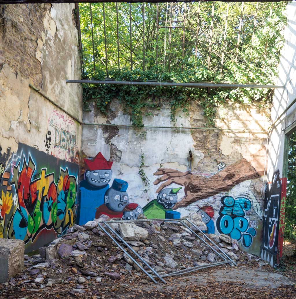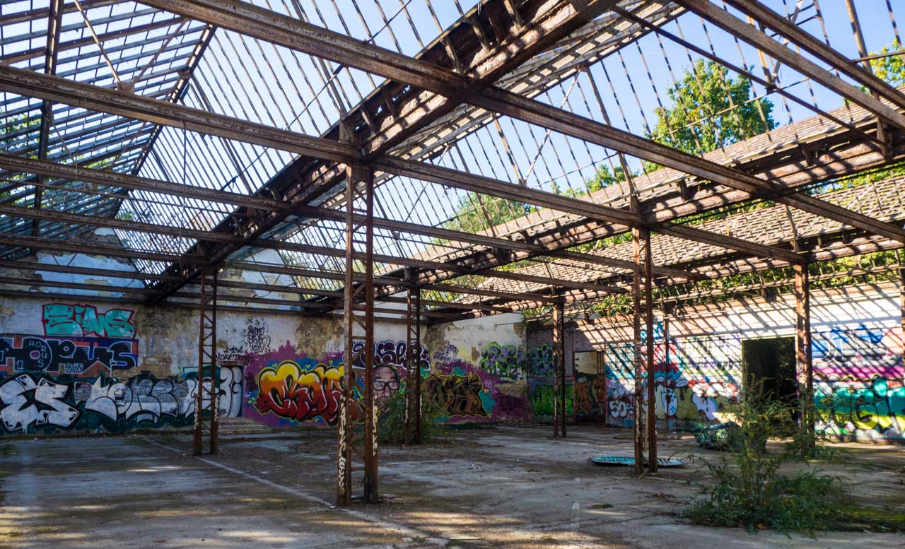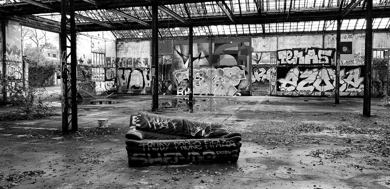 Il faut dire que le lieu se prête à l’art urbain, il ne reste que des murs et des armatures métalliques en ruines et l’ambiance est parfaite ! Au milieu de tout ça, il y a même un canapé, graffé lui aussi…