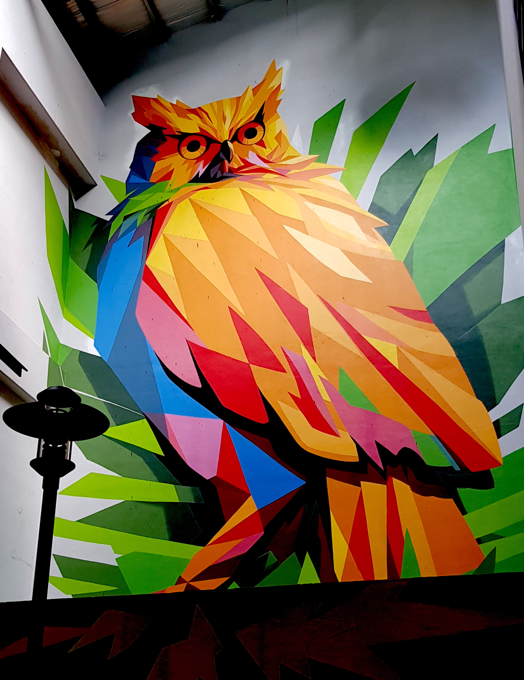 Pour commencer, dirigeons-nous vers The Linc KL, un énième centre commercial ayant pour vocation d’être “tourné vers la nature”. Quelques arbres ont survécu au bétonnage du lieu et les magasins sont curieusement vides mais je n’étais pas là pour faire les boutiques. Grâce aux gardiens du parking, j’ai réussi à trouver de jolis examples d’art urbain consacrés aux animaux de Malaisie. On commence par The Owl, réalisé par Amarul Abdullah. Je vous avais déjà montré quelques unes de ses réalisations l’année dernière à Jalan Alor.