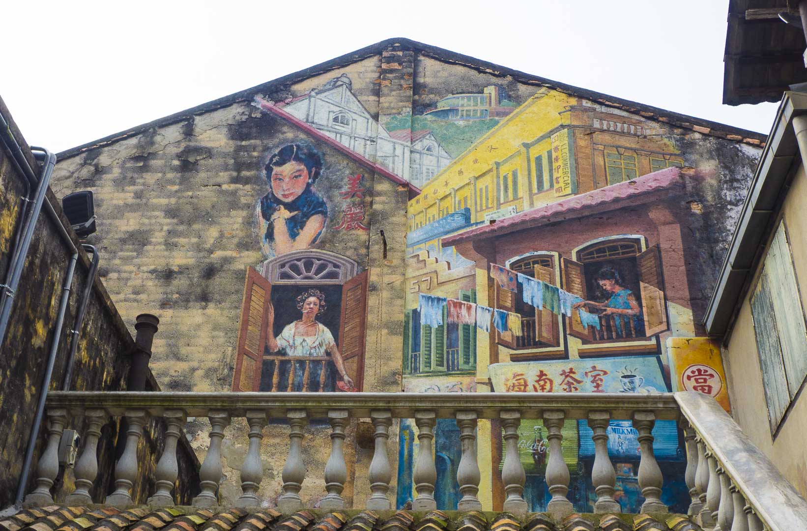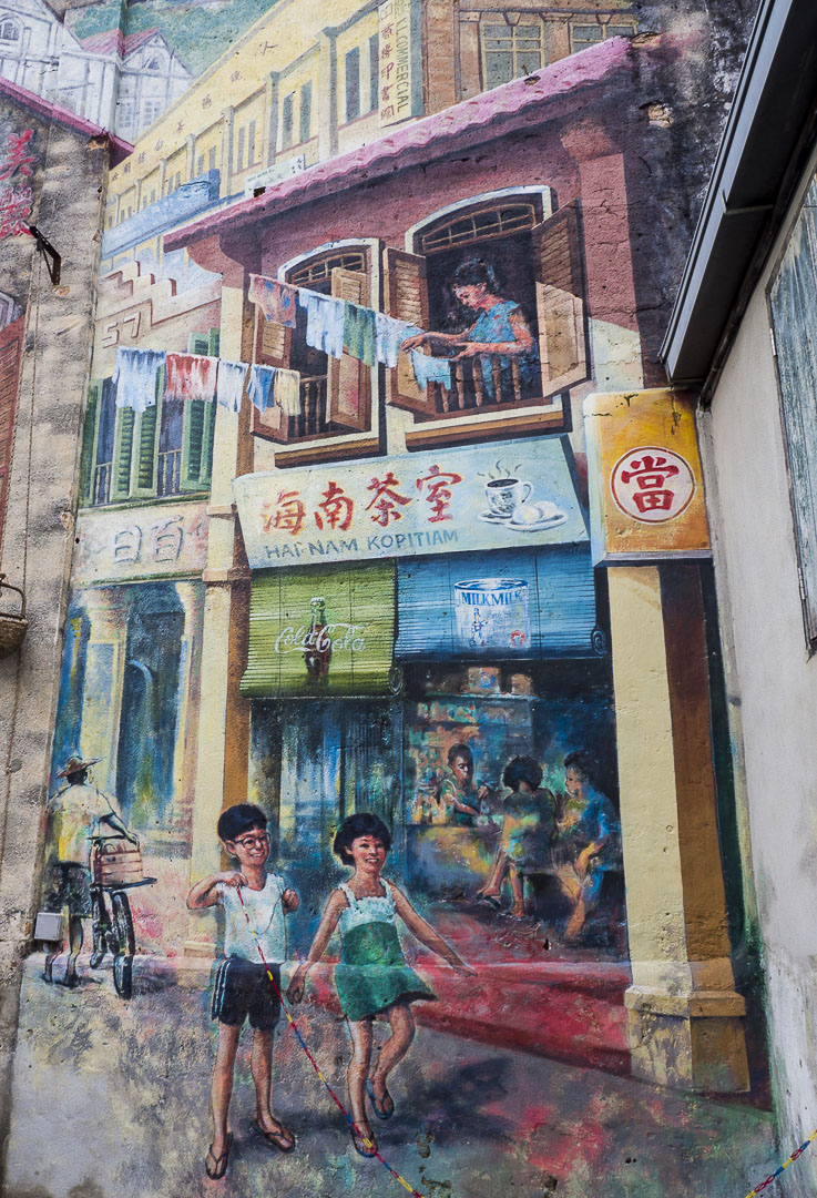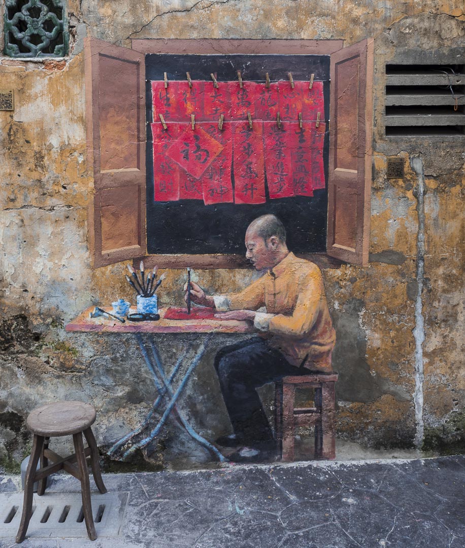 Une fois à Lorong Panggung, on trouve assez facilement l’allée Kwai Chai Hong ornée de lanternes rouges et couverte de fresques représentant le quartier chinois de Kuala Lumpur dans les années 60. Divers métiers de l’époque (barbier, écrivain, musicien et… prostituée !) ainsi que des scènes de la vie quotidienne ont été représentés par 5 artistes locaux, Khek Shin Nam, Chan Kok Sing, Chok Fook Yong, Chew Weng Yeow et Wong Leck Min.