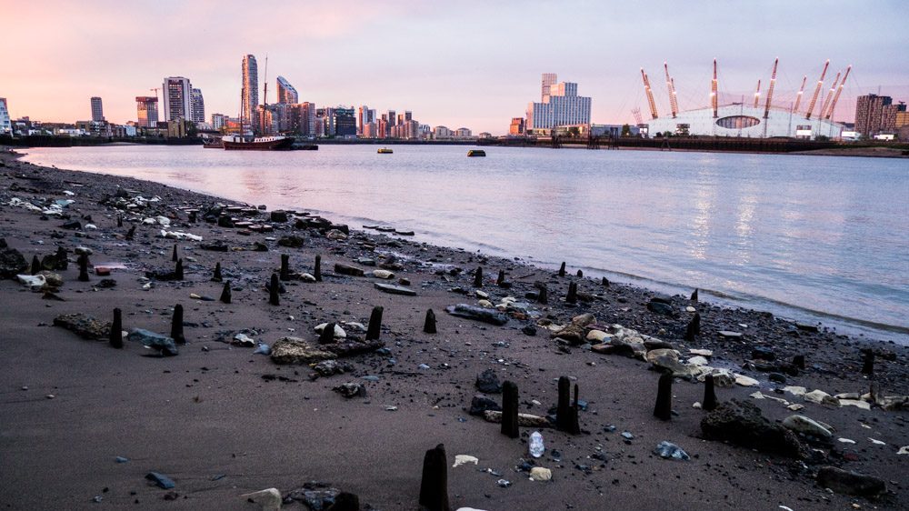 Il faut faire attention où on met les pieds car on trouve de tout, notamment des objets pointus en métal ou ces pieux qui sont visibles à marée basse. On aperçoit le Millennium Dome sur l’autre rive .