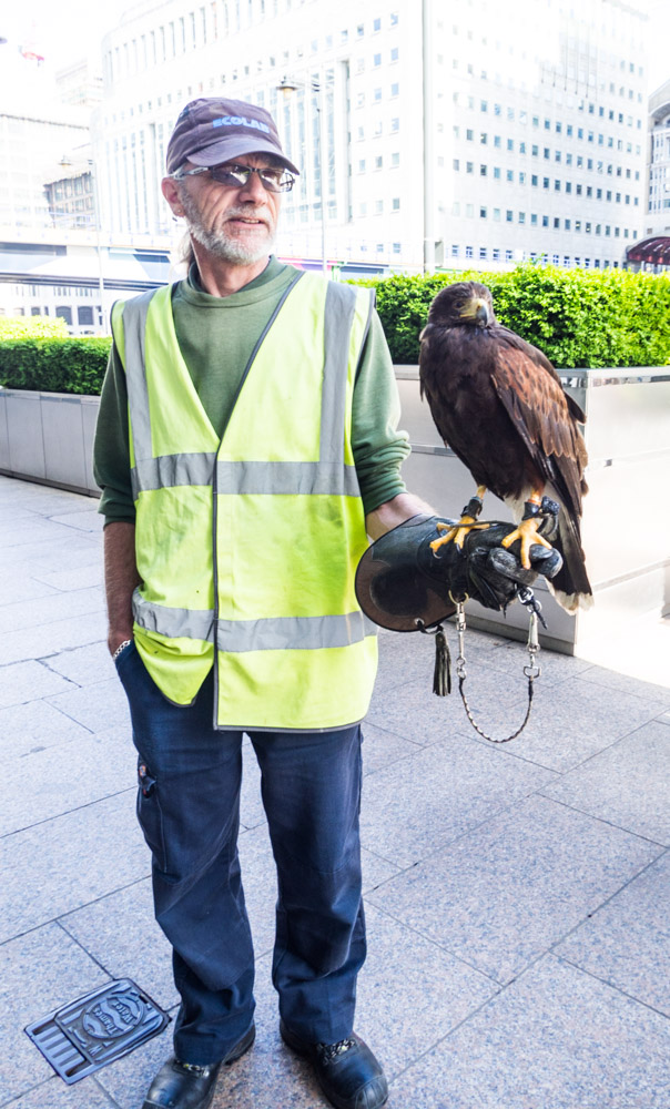 Pour finir, j’ai fait une rencontre inattendue à Canary Wharf : Paul et son faucon Lemmy, en plein travail ! Ils ont eu la gentillesse de se laisser prendre en photo et j’ai appris que la municipalité de Londres emploie des oiseaux de proie pour intimider les pigeons qui ont tendance à envahir la ville. Lemmy ne chasse pas les pigeons, mais la seule présence de ce prédateur suffit à décourager les oiseaux de s’installer.