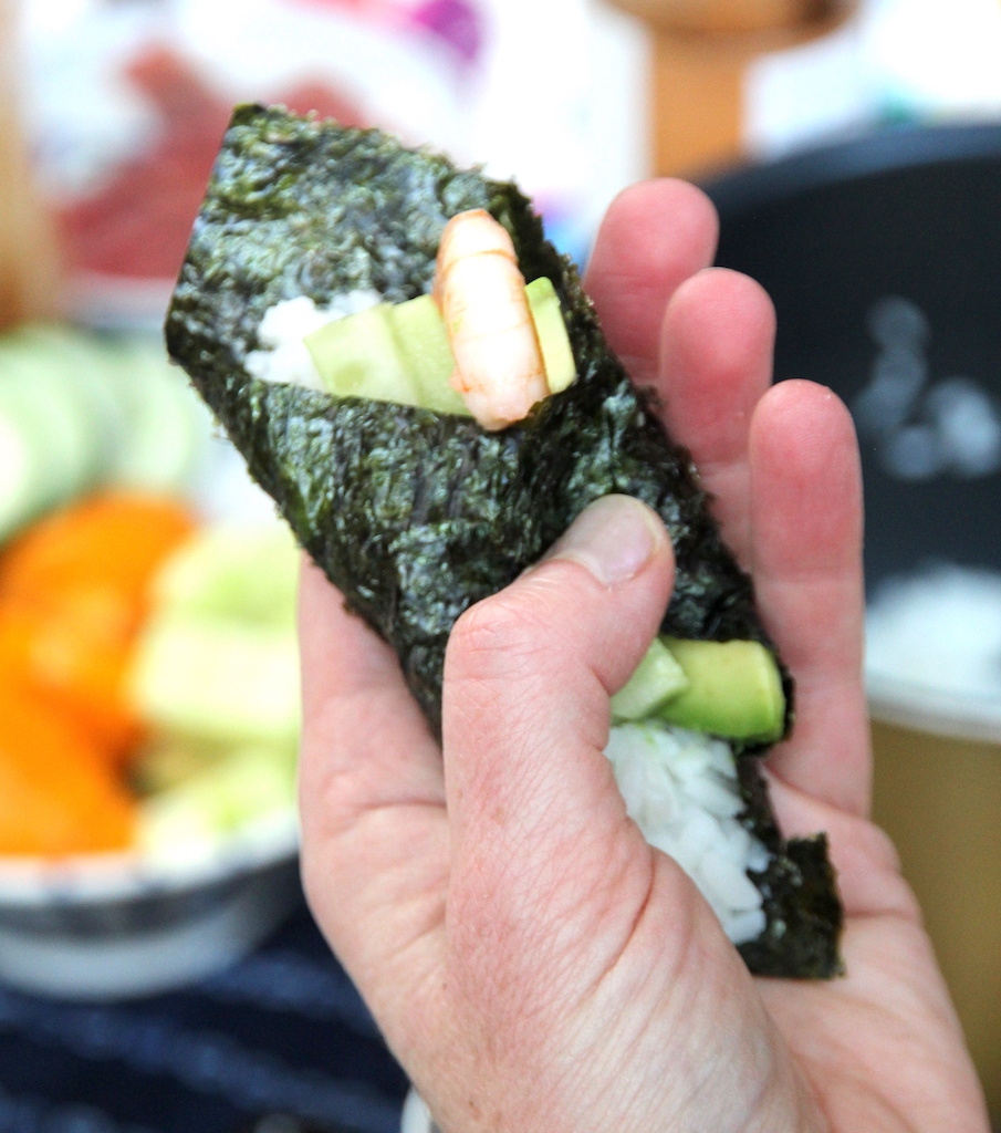 - Pour les temaki, il suffit de couper en 4 une feuille d’algue nori, de la poser en digaonale dans la paume de la main pour la garnir de crevette, avocat, concombre…