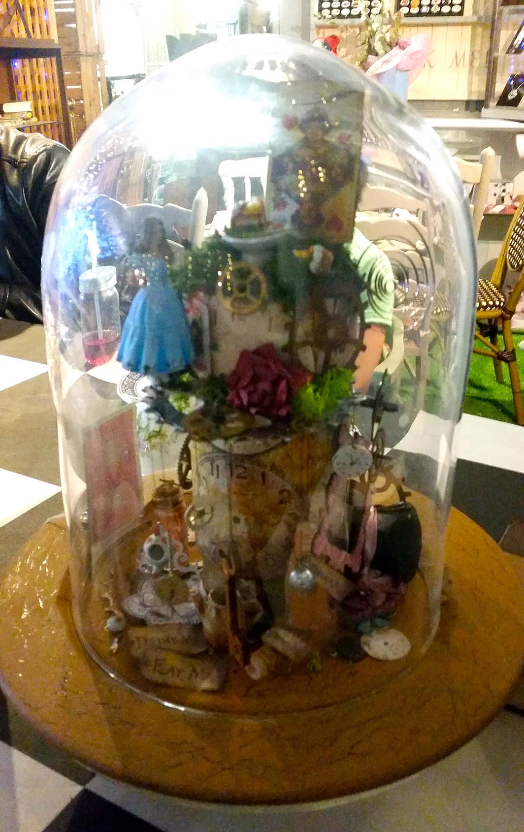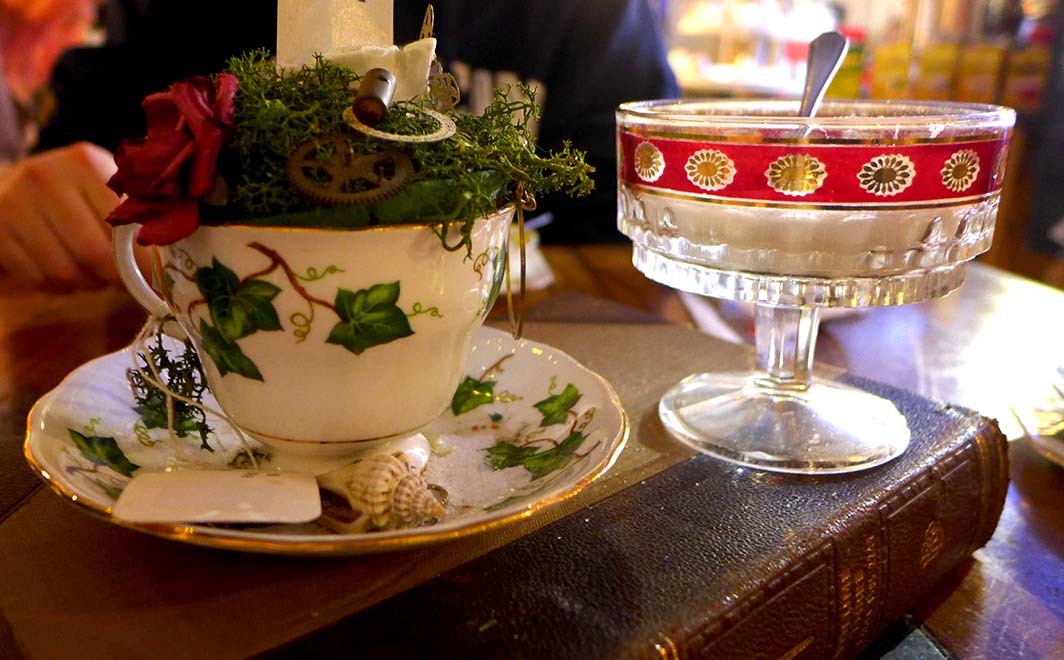 Le salon de thé est entièrement dédié à l’histoire d’Alice. Les murs sont décorés de champignons, on y trouve des cartes à jouer, des globes de verre, des théières, des tables à damiers, bref tout ce qu’il faut pour une tea-party chez le Chapelier Fou.