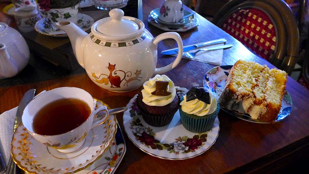 Toute la vaisselle est vintage, avec des tasses en porcelaine anglaise dépareillée, des plats à gâteaux à étages, on a vraiment l’impression d’être dans un autre monde. De plus les cupcakes et autres gâteaux sont délicieux.