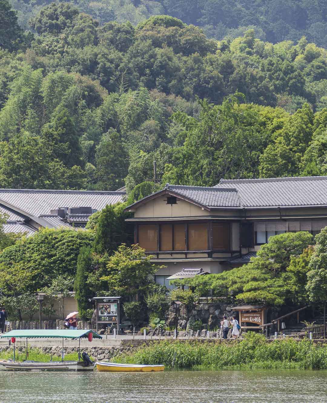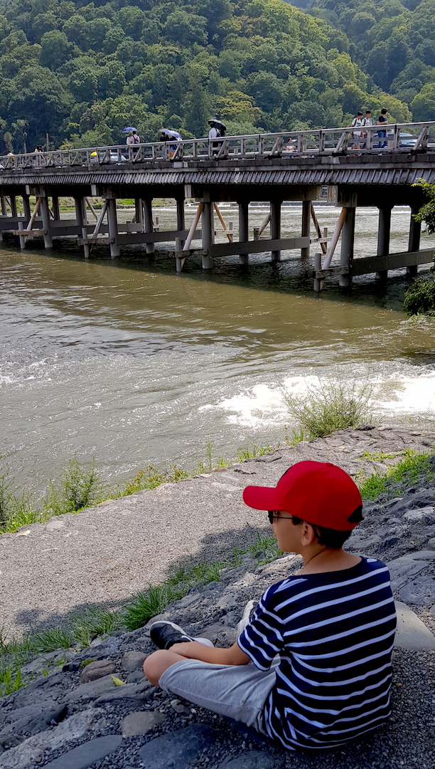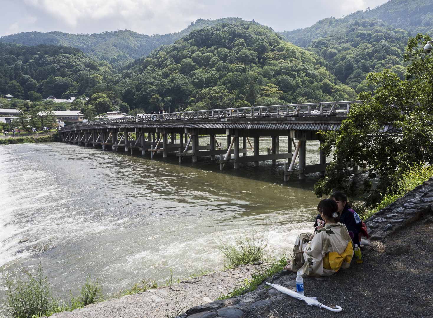 Après avoir longé la rue principale nous sommes arrivés au pont Togetsukyo (pont traversant la lune) qui enjambe la rivière Katsura. Le pont date du 9ème siècle mais a été déplacé au fil du temps, suite à des incendies (comme la plupart des constructions en bois de Kyoto !). Nous y avons fait une petite halte à l’ombre, au bord de l’eau…