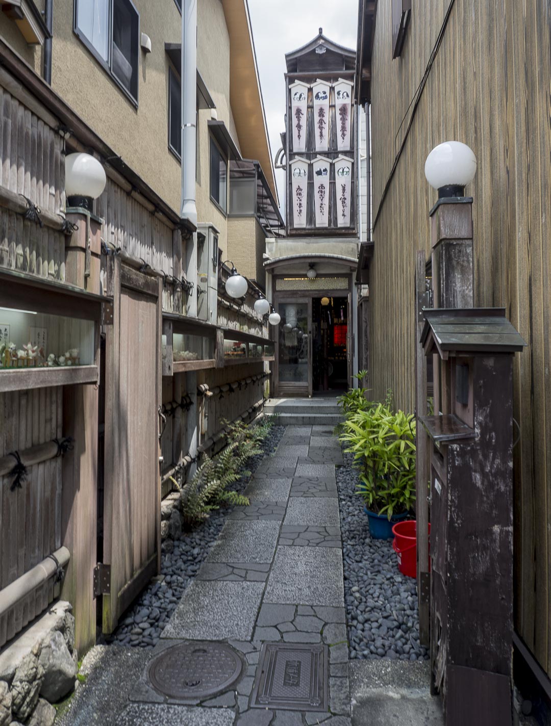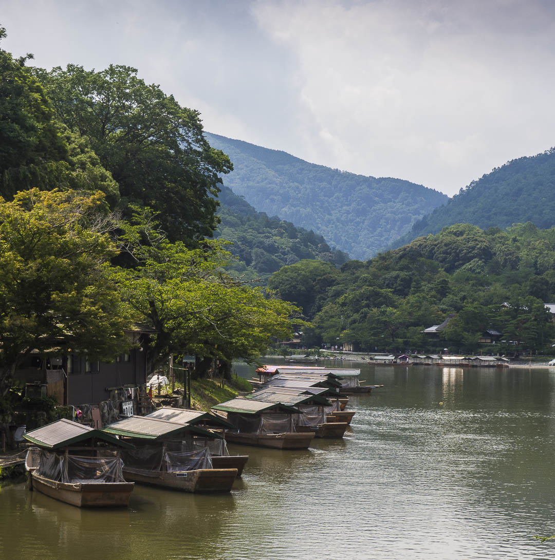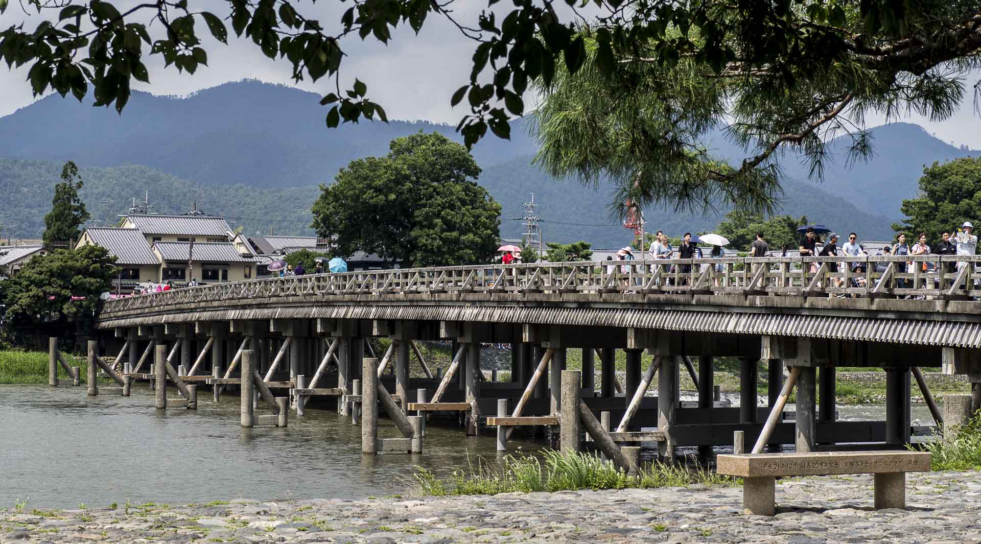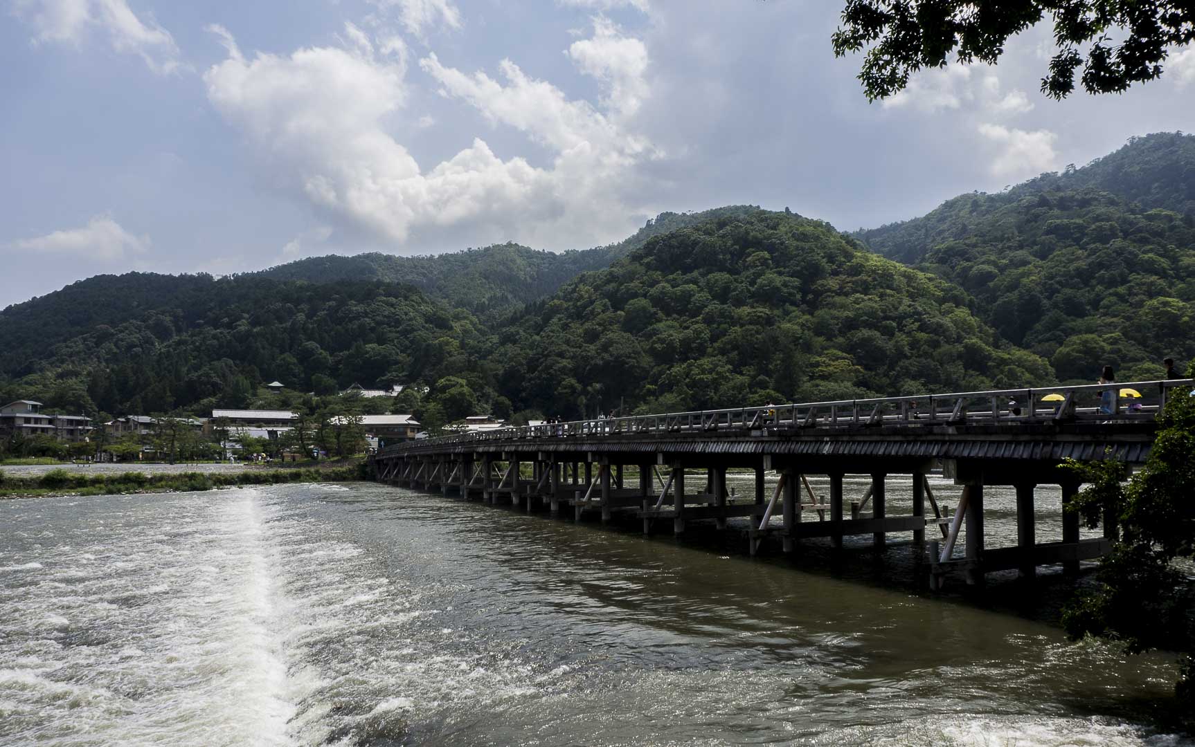 Après notre promenade dans la forêt de bambous nous avons repris le chemin d’Arashiyama sous un soleil de plomb. Ici les parapluies servent aussi à se protéger du soleil…Au Japon, tout est propre, les jardins et les allées sont bien entretenus.Après avoir longé la rue principale nous sommes arrivés au pont Togetsukyo (pont traversant la lune) qui enjambe la rivière Katsura. Le pont date du 9ème siècle mais a été déplacé au fil du temps, suite à des incendies (comme la plupart des constructions en bois de Kyoto !). Nous y avons fait une petite halte à l’ombre, au bord de l’eau… Puis nous avons traversé le pont et refait une halte de l’autre côté (Canaillou commençait à fatiguer !). Si ce pont de bois long de 155 mètres vous semble familier c’est peut-être parce que vous connaissez une estampe du peintre Hokusai le représentant…On pense que cette estampe date de 1830.Ma version, en toute modestie ! 😉Il paraît que lorsque les enfants japonais atteignent l’âge de 13 ans, il leur est conseillé de se rendre au temple Horin-Ji, de l’autre côté du pont, pour acquérir le don divin de la sagesse, . En revenant du temple, il faut traverser le pont sans se retourner, sinon la sagesse sera perdue !