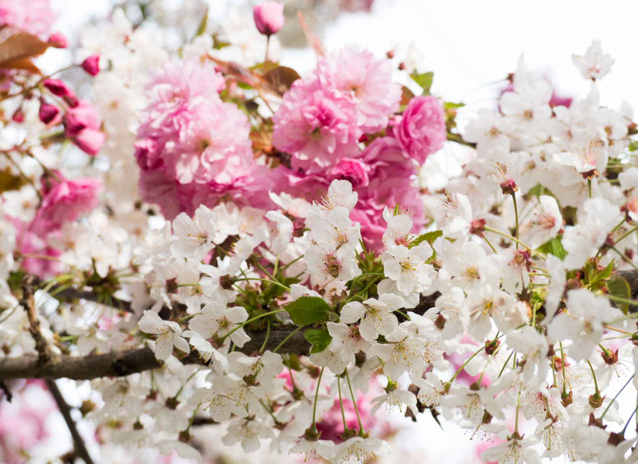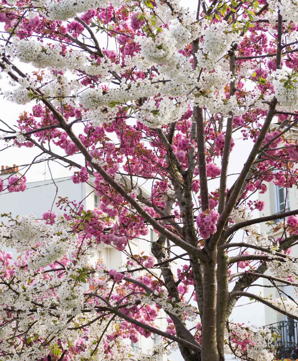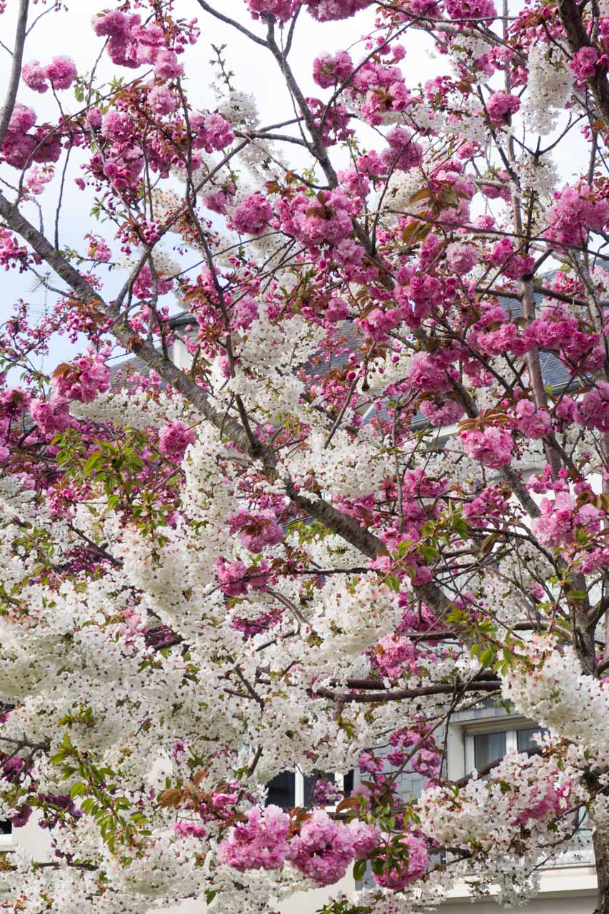 Le printemps est là, même si aujourd’hui les giboulées n’ont pas arrêté… Nous avons un peu l’impression de faire marche arrière après un week-end bien ensoleillé. Entre deux averses je suis sortie prendre quelques photos des cerisiers du Japon qui poussent sur la petite place en bas de ma rue. Cela fait un moment que je me dis qu’il faut que je les prenne en photo avant que les fleurs disparaissent car l’un de ces arbres a la particularité d’avoir des fleurs de deux couleurs.