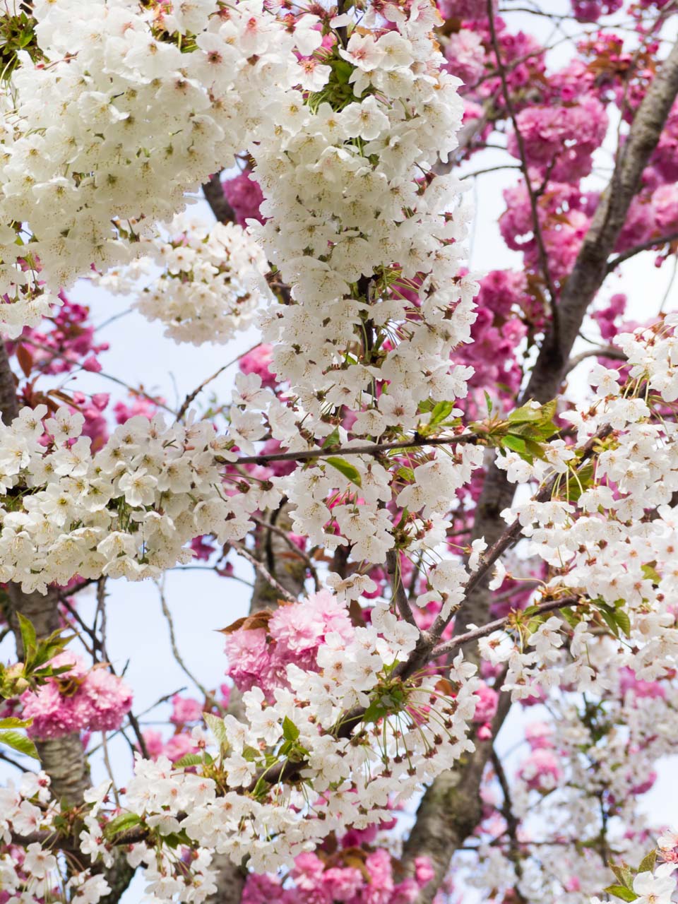 Quand on regarde de près on voit que les fleurs ne se ressemblent pas du tout : les blanches font penser aux fleurs de cerisiers à fruits, et les roses aux cerisiers du Japon. Et l’arbre a bien l’air d’avoir été greffé. En plus c’est le seul à avoir cette particularité, les autres arbres n’ont que des fleurs roses. as-tu vu l’explication de Xavier un peu plus haut dans les commentaires ? Bises !