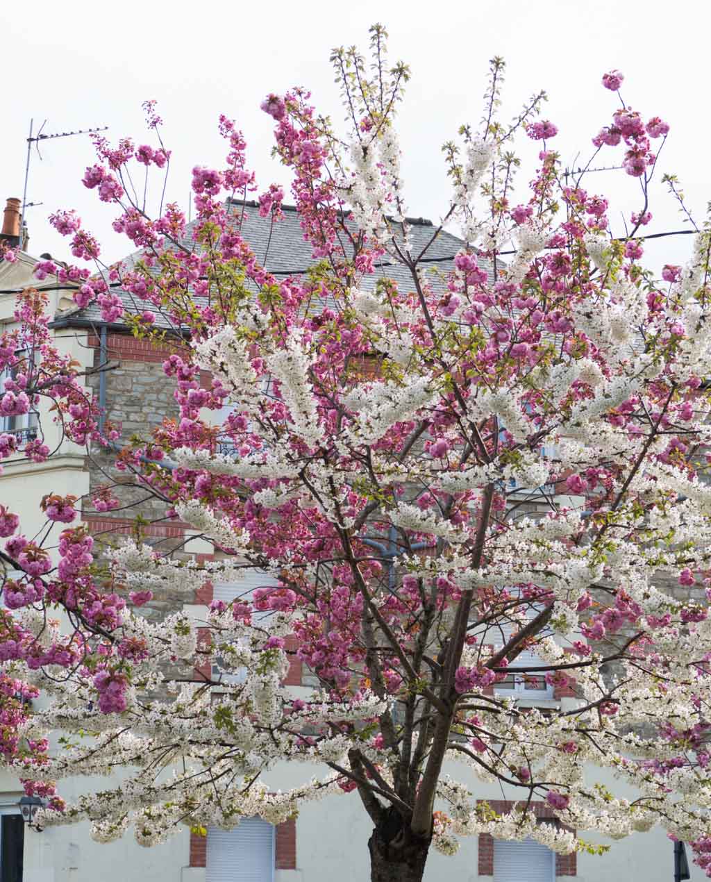 Au début j’ai cru qu’il y avait deux arbres mais non, c’est bien le même arbre avec des branches chargées de fleurs blanches ET roses.