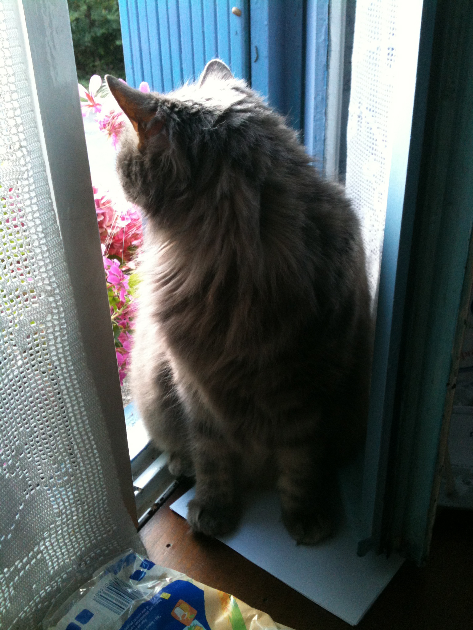 Avant d’arriver en Bretagne, j’avais une amie qui passait le nourrir et il reste seul, il est habitué. Depuis que nous sommes ici, mes voisins avec qui nous avons sympathisé, ont eu la gentillesse de passer quand nous sommes partis dans le Sud. Mais pour peu de jours, il reste tout seul avec une ration gargantuesque de croquettes!