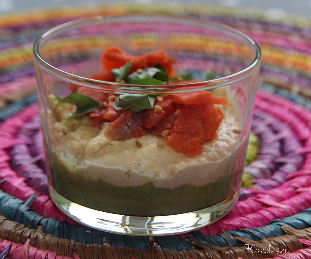 Pour Canaillou, qui est intolérant aux produits laitiers, j’ai remplacé la crème par du houmous. Voici sa petite verrine :
