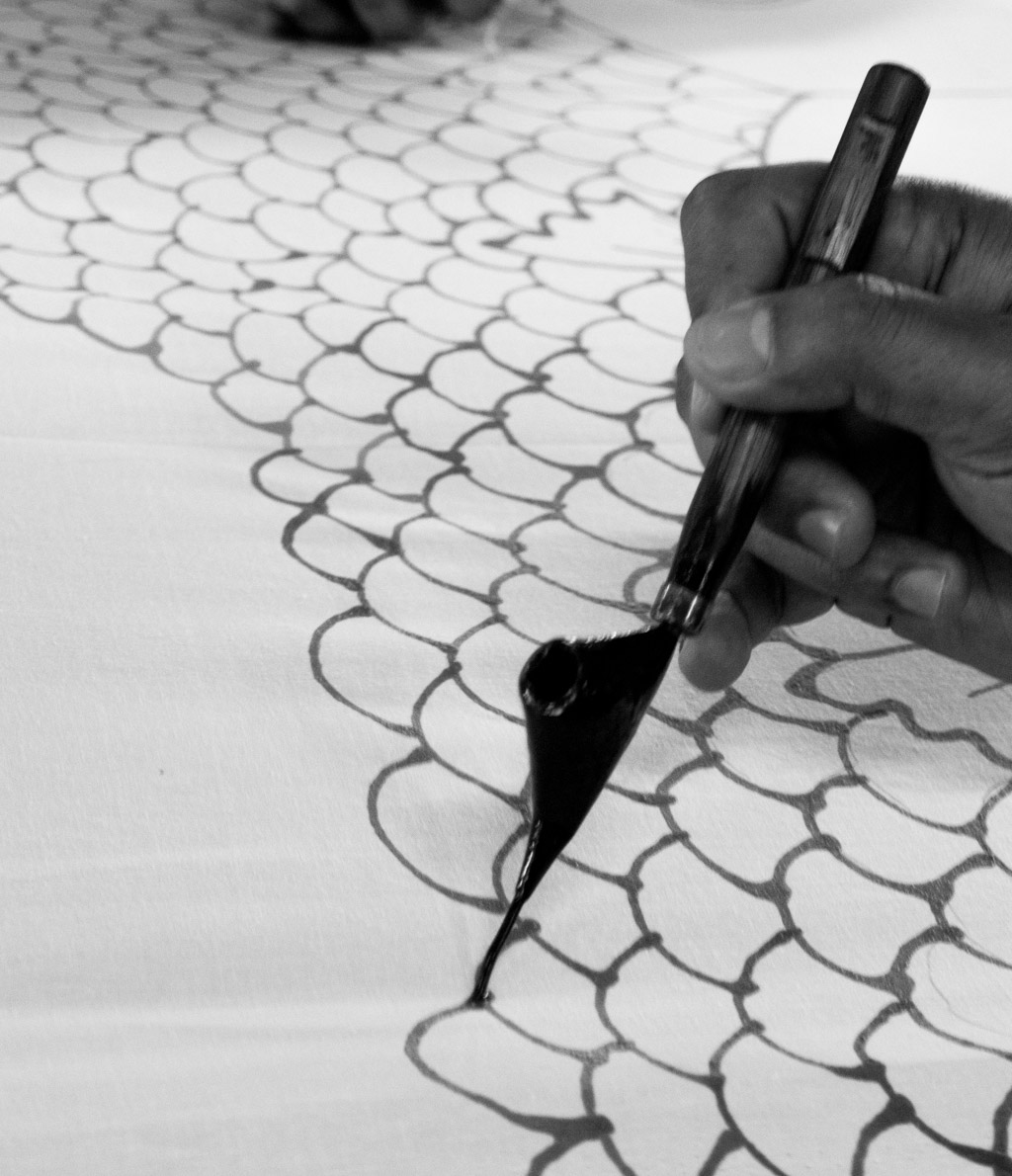 Il y a deux façons de déposer la cire sur le tissu. La première méthode dépose la cire à la main avec un “canting” en cuivre, une sorte de stylo à réservoir (contenant la cire chaude).