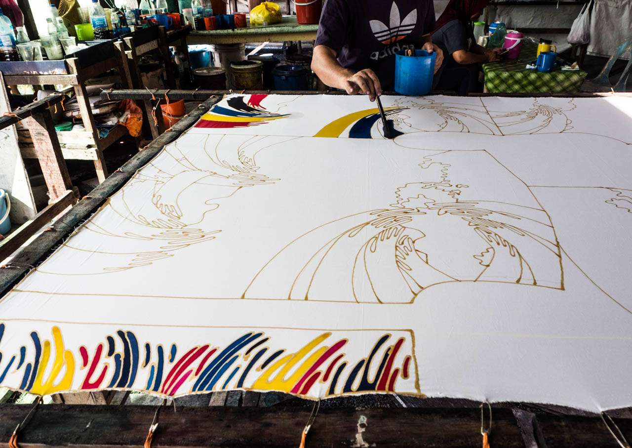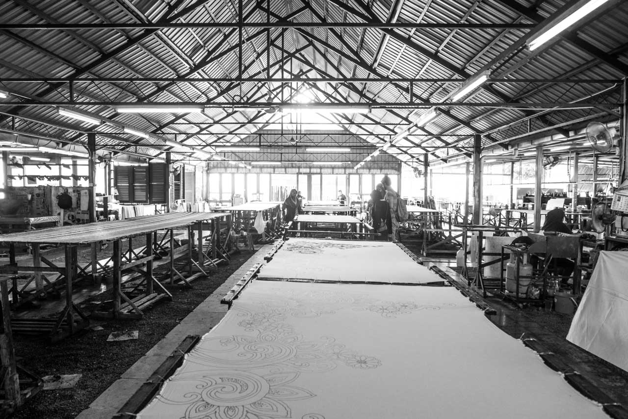 Craft Batik est divisé en deux avec une partie magasin et une partie atelier. Quand nous sommes arrivés, nous avons demandé à voir l’atelier et on nous a fait visiter ce dernier. J’ai un peu regretté que la visite soit si rapide mais j’ai pu rester ensuite faire mes photos tranquillement. L’atelier est plutôt basique, c’est une sorte de grand hangar. On s’étonne même que des tissus aussi délicats soient peints dans cet environnement plutôt brut.
