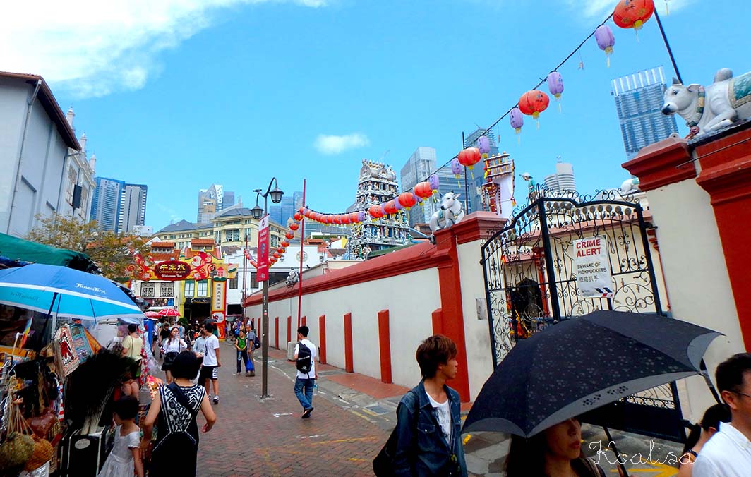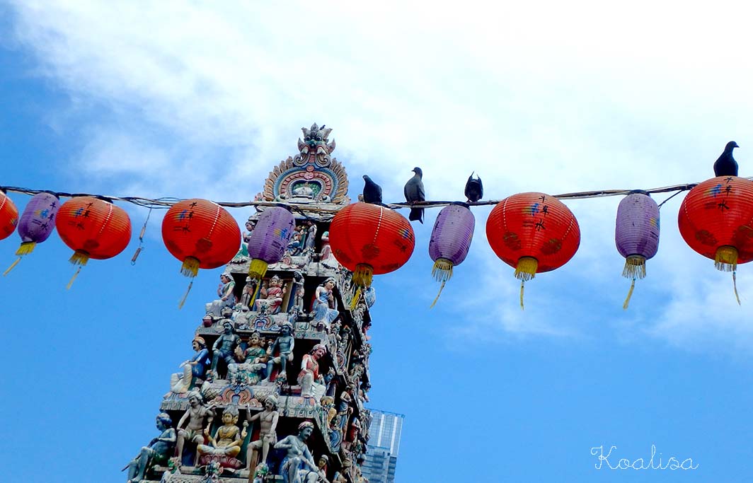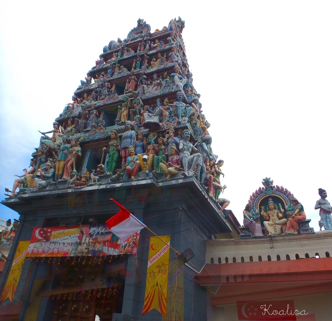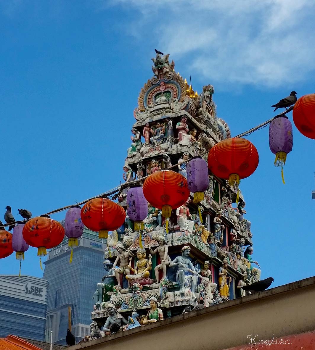 Le retour du froid en Bretagne m’incite à me replonger dans mes photos de l’été dernier et je vais vous emmener aujourd’hui dans le quartier de Chinatown à Singapour. Chats porte-bonheur, fausses Rolex, bijoux et breloques colorées, on trouve de tout à Chinatown ! Nous nous y sommes arrêtés lors de notre visite de la ville en bus à impériale et avons pu par la même occasion admirer le Sri Mariamman Temple, le temple hindou le plus ancien de Singapour, construit en 1827 puis modifié plusieurs fois depuis. C’est son gopuram (cette haute tour) qui se remarque de loin. Très coloré, il est constitué de 6 étages sculptés.