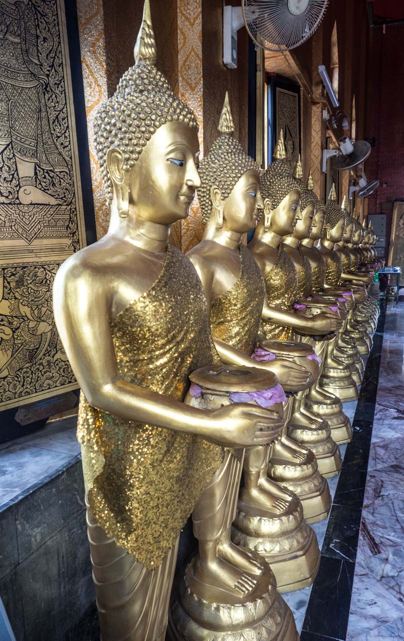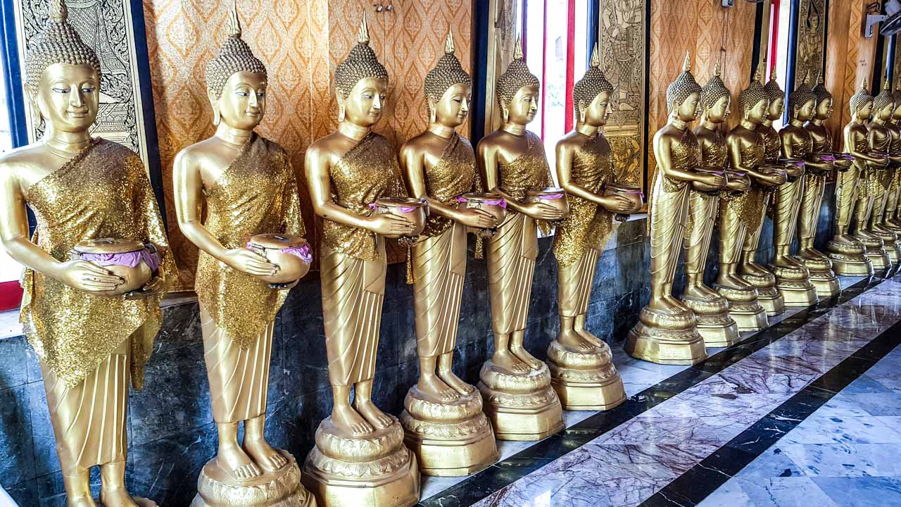 A Wat Chetawan, on peut admirer toute une rangée de statues de bouddha. Si vous laissez une pièce à l’une des statues il faudra faire de même pour toute la rangée !