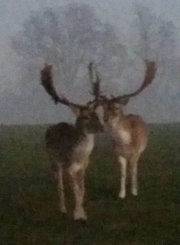 Il faisait d’ailleurs complètement nuit quand nous avons fait une très jolie rencontre… La photo est ratée car il y avait un épais brouillard et en plus je n’avais que mon téléphone avec moi ce jour-là, mais je la partage quand même car ces deux cerfs n’étaient qu’à quelques mètres de nous et c’est un beau souvenir de cette promenade…